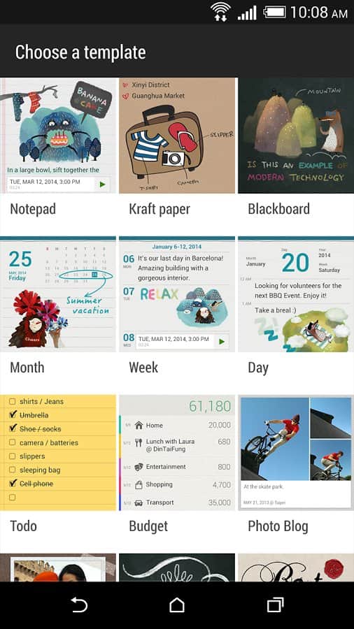 В отличие от большинства конкурентов, HTC Scribble позволяет работать не только с текстами и списками, но и рисунками, фотографиями или даже GIF-анимацией. Чтобы ускорить этот процесс в приложении заготовлены шаблоны, которые помогут пользователю организовать всю необходимую информацию. Из-за того, что результат, как правило, получается ярким и нестандартным, HTC Scribble позиционируется компанией как хорошее подспорье для блогеров, с тем же успехом его можно порекомендовать тем, кто ведет личный дневник.