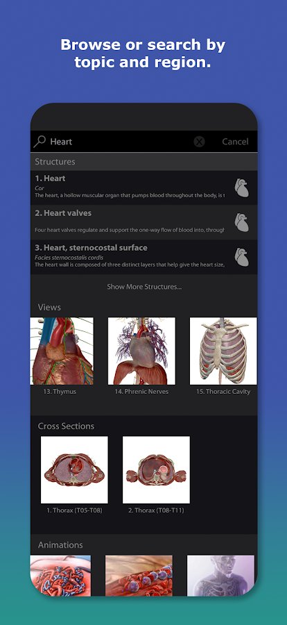 Начните с функции просмотра (View) сотен миниатюрных изображений, которые отсортированы по отделам и анатомическим системам.