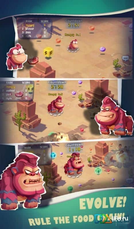 Hungry Monsters! – игра на андроид, где вы будете управлять монстром, который исследует мир вокруг себя и ищет пропитание. Проведите своего героя по многочисленным мирам и аренам и поедайте многочисленную еду, повстречавшуюся вам на пути при этом увеличиваясь в размерах. Также вы будете встречать монстров других игроков если они меньше вашего монстров, то поедайте и их, а если больше, то избегайте с ними встречи. Также не забывайте собирать по пути многочисленные бонусы и усиления, которые помогут вашему монстру выжить в опасных условиях. Вступайте в схватки с другими игроками со всего мира и сражайтесь с ними на арене.