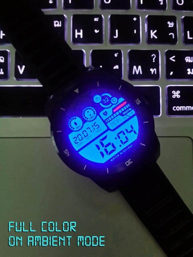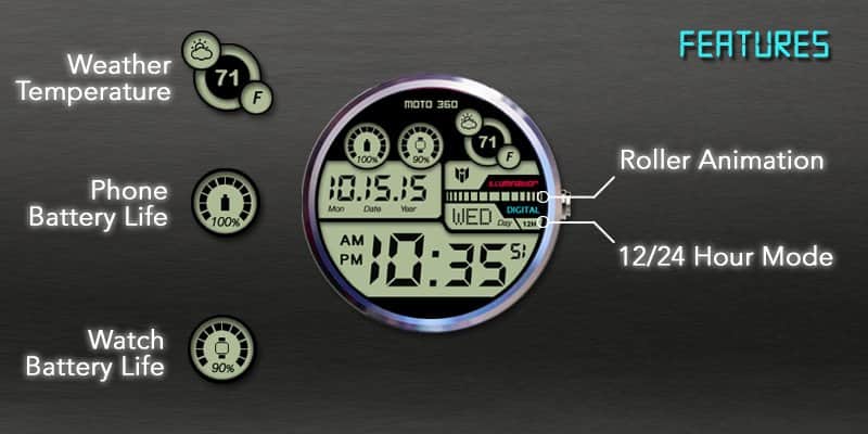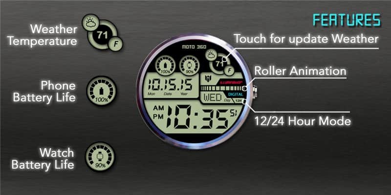 Есть те, кому нравится минимализм и отсутствие раздражающих элементов, а есть те, кому это кажется скучным. Данный циферблат создан для тех, кто любит много мелких деталей на часах и футуристичное оформление. Здесь в ярком и стильном дизайне вы сможете получить информацию о текущем времени, дате (число, месяц, год), погоде, температуре, состоянии заряда часов и подключенного смартфона.