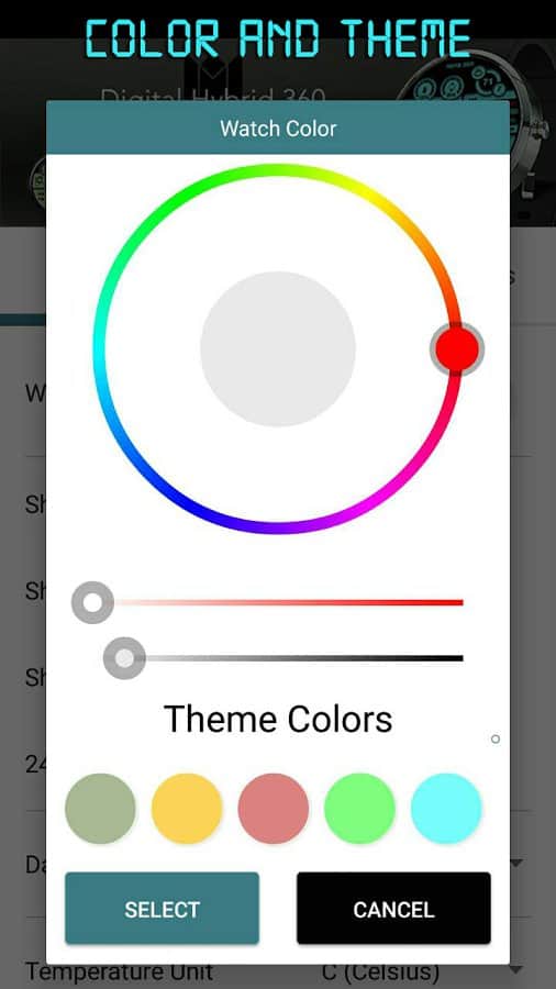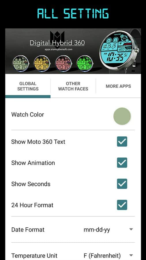 В настройках можно выбрать цветовое оформление, формат даты, отображение температуры (по Фаренгейту/по Цельсию) и формат времени (12 или 24 часа) а также добавить отображение секунд.