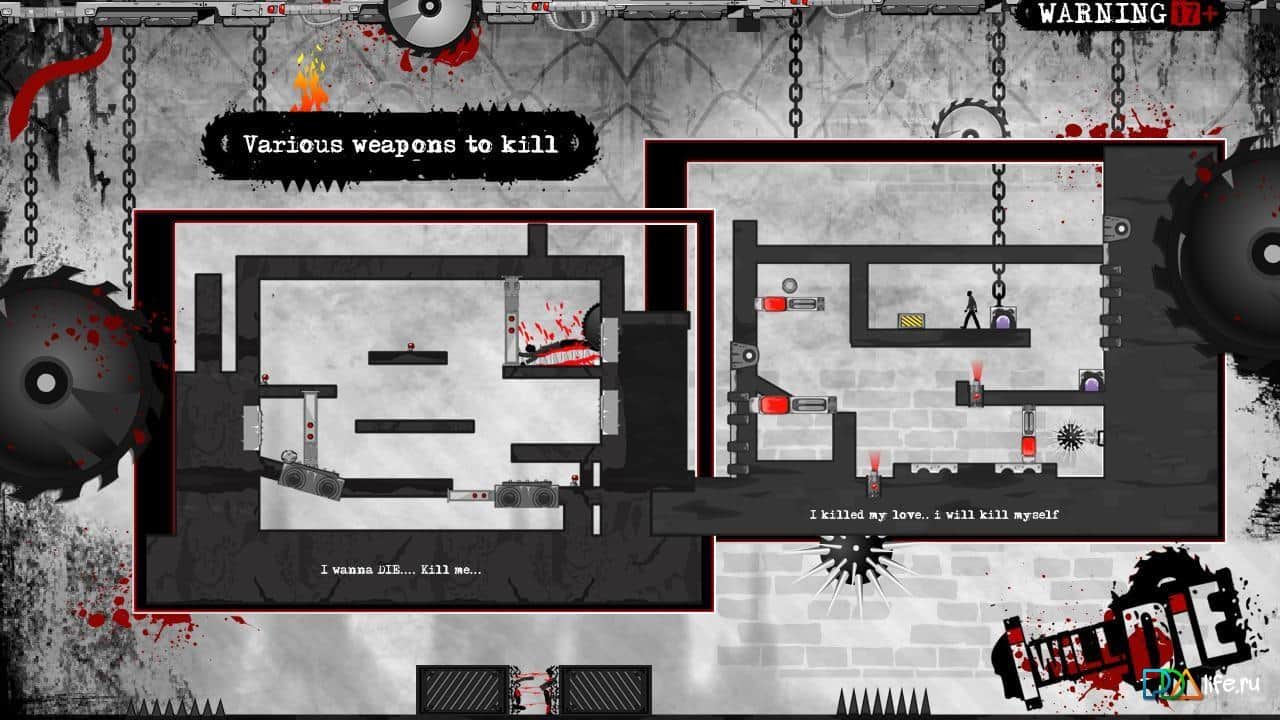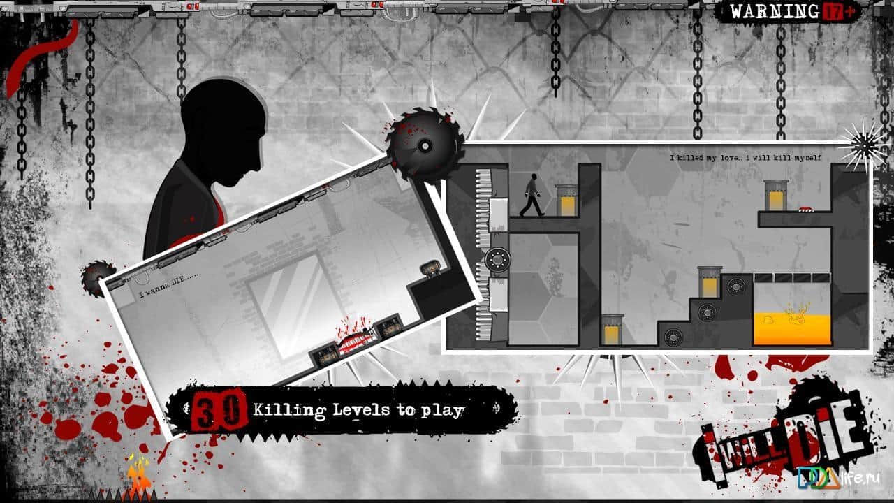 I Will Die - эта кровавая игра для андроид в стиле странного экшена отнюдь не блещет оптимизмом и верой в себя и будущее. Это скорее способ поплакаться на жизнь и пострадать. Пессимизм в чистом виде! Главный герой - человек, явно уставший от жизни. События его жизни и обстоятельства заставляют его пойти на крайнюю меру - самоубийство, причем достаточно болезненное и кровавое...Ваша главная задача - сделать все возможное, чтобы главному герою удалось уйти из жизни таким странным и жестоким способом.