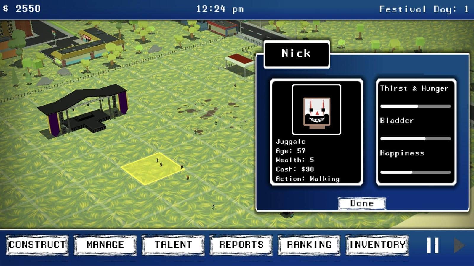 ICP: The Gathering – симулятор на андроид, где вы будете ответственный за запуск самого популярного праздника в году The Gathering. Вашей задачей будет распланировать план действий и запустить свой собственный фестиваль. Вашей главной задачей будет занять лидирующие позиции в таблице лидеров и выполнять различные действия. Каждый участник фестиваля будет вести свою уникальную жизнь есть когда голодны, принимать ванну, снимать деньги в банкомате и выполнять свои этапы в строительстве и создании праздника. Покупайте землю для фестиваля и нанимайте музыкантов и комиков, которые будут развлекать толпу. Зарабатывайте на фестивале большое количество денег и тратьте их на расширение площади фестиваля.