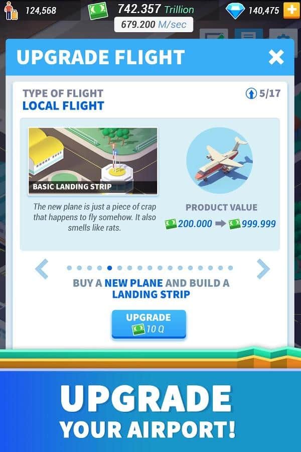 Idle Airport Tycoon - Tourism Empire - увлекательная игра на транспортную тематику геймплей которой сочетает в себе элементы аркадного кликера, экономического симулятора стратегии в реальном времени. И так, для начала вам предстоит взять под свое управление небольшой аэропорт и превратить его в крупнейшего представителя на рынке, а вам же в свою очередь необходимо разбогатеть, а вот как вы будете тратить свои сбережения решать уже вам.