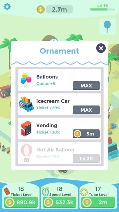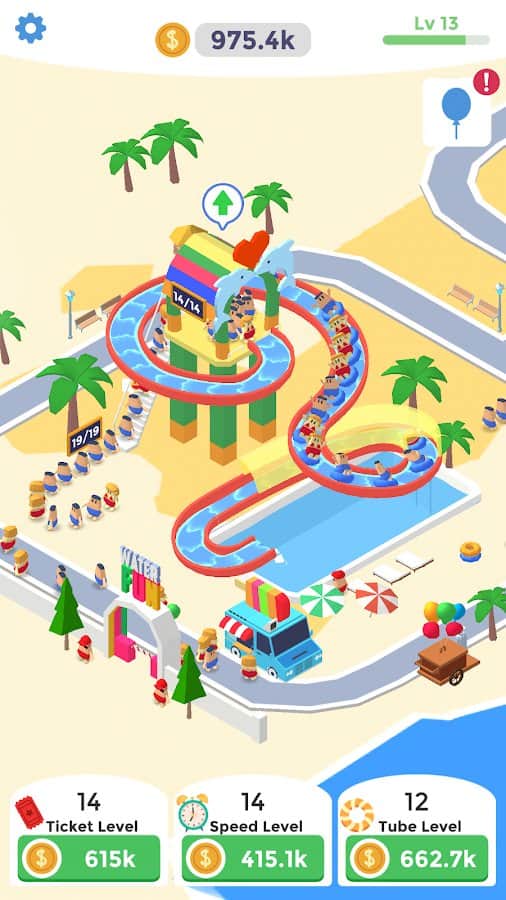 Idle Aqua Park – уникальная игра на андроид, где вы будете управлять собственным аквапарком. В этой игре вашей главной целью будет создать самый лучший аквапарк в мире и собирать толпы посетителей. Стройте невероятные и ужасающие аттракционы, создавайте множество бассейнов и зон отдыха. Создайте уникальные аттракционы и все люди захотят попасть именно в ваш аквапарк. Наблюдайте за тем как выселяться ваши посетители и поучайте деньги. Найдите новые способы для зарабатывания денег и начните действовать прямо сейчас. Получайте бонусы и усиления и соревнуйтесь с другими игроками за лучшие результаты в игре.