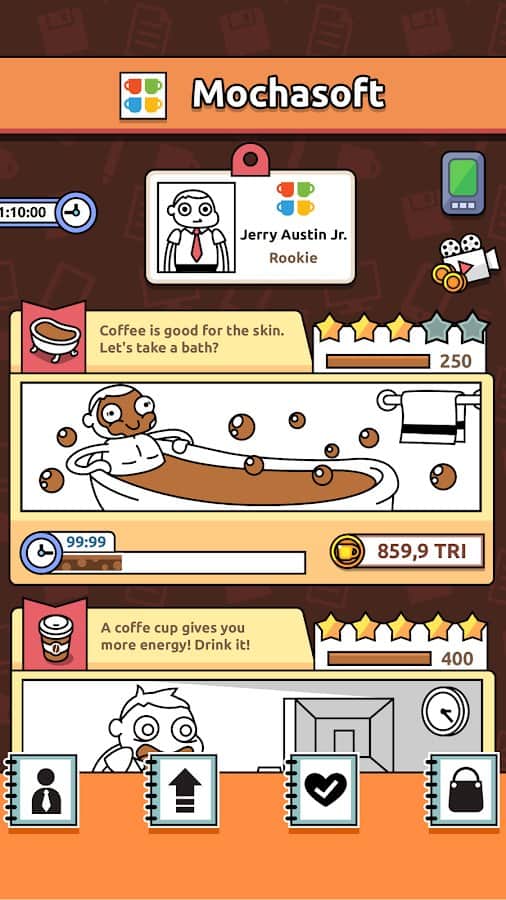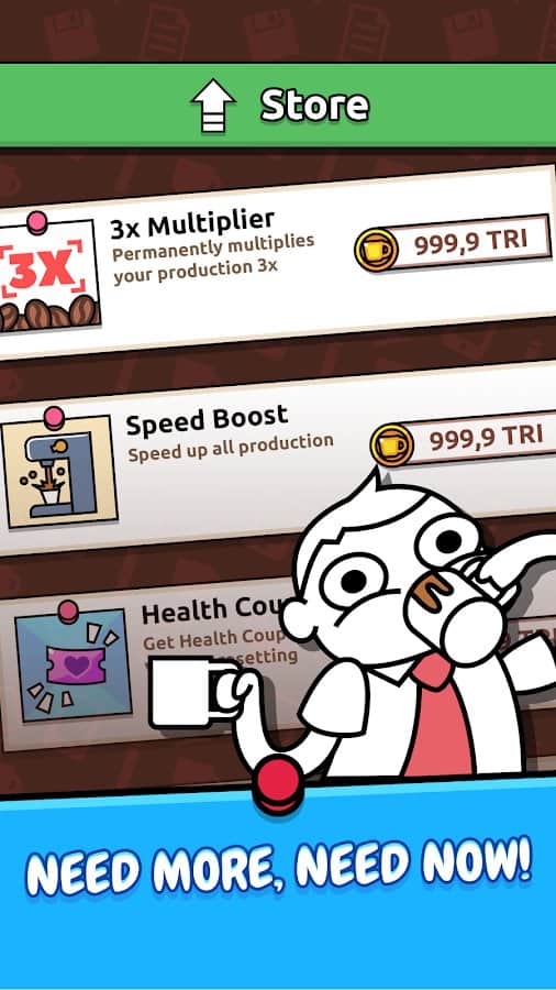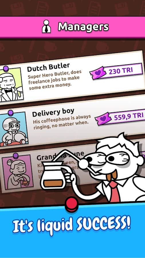 Idle Coffee Inc. - Caffeine Rush Simulator Clicker – кликер на андроид, где вы будете управлять главным героем который пьет кофе. Наш герой хочет достичь отличных результатов на своей работе и подняться как можно выше по карьерной лестнице. И для этого ему необходима энергия, которую он черпает из кофе, так что приготовьтесь как можно чаще нажимать на экран своего телефона или планшета чтобы заставить героя пить кофе и ответственно выполнять свою работу. Не допускайте снижения кофеина в крови героя и выпивайте как можно больше чашек кофе в день. Игра порадует игроков отличной рисованной графикой и легким управлением.