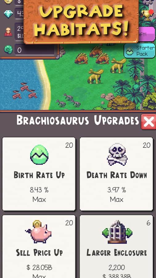 Idle Dino Zoo - lобро пожаловать, в идеальный симулятор парка динозавтров! Тебя ждёт невероятный мир динозавров и ты их будущий создатель. Наша игра достаточно проста в своих функциях, а ещё твой парк продолжит расти и зарабатывать деньги даже во время твоего отсутствия. Покупай, захватывающие дух, аттракционы и увеличивай рождаемость своих любимцев. Открой его для посетителей и зарабатывай деньги, это поможет тебе развивать свой бизнес и сделать свой парк ещё более интересным. Продавай или же покупай динозавров на торговом посту и зарабатывай драгоценные камни.