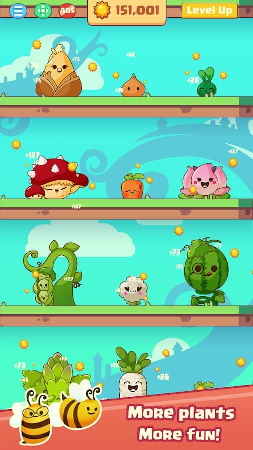 Idle Garden – увлекательная игра на андроид, где вы будете ухаживать за уникальным садом. В этой игре вы будете выращивать в своем саду различные растения, которые будут приносить вам пользу и витамины. Размещайте растения на разных уровнях своего сада и не забывайте ухаживать за ними. Касайтесь экрана своего телефона или планшета и собирайте ценный урожай и получайте награды. Развивайте и прокачивайте свои растения чтобы они изменяли свой внешний вид и приносили таким образом больше витамин. Повеселитесь на вечеринках растений и наблюдайте как они забавно танцуют. Постоянно увеличивайте число растений и количество уровней в саду.