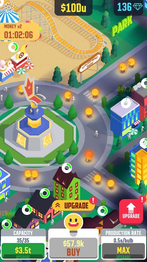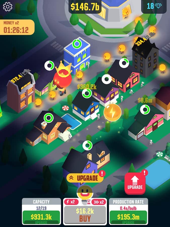 Idle Light City - однажды, по неизвестной никому причине огромный город погрузился во тьму. На улицах нет ни одно фонаря, а солнце как будто забыло о его существовании. Тебе предстоит помочь городу выбраться из тьмы, пролей свет на его прекрасные дома, парки развлечений, фабрики и магазины. Освещай каждый уголок городка и зарабатывай все больше денег. В твоём распоряжении целая фабрика лампочек, кликай на экран, чтобы изготовлять больше. Покупай улучшения для своего города и фабрики, расширяй территорию производи больше лампочек и покажи всему миру какой прекрасный город кроется во тьме.