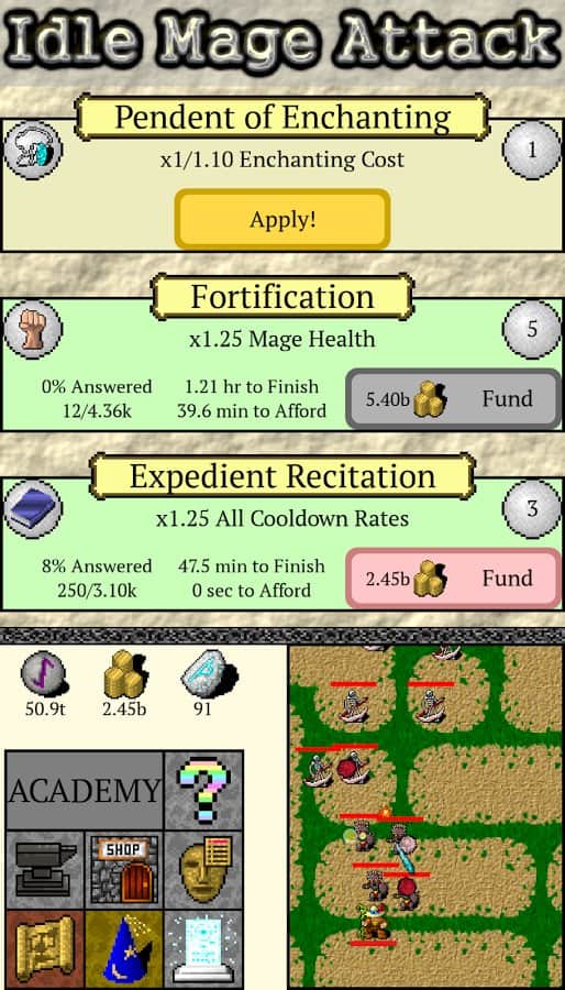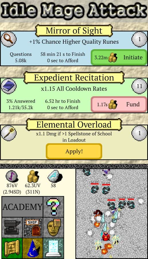 Мир Idle Mage Attack полон настоящих сокровищ и сильнейших магов, пытающихся их собрать. Предстоит и самому обучиться сильнейшим заклинаниям, проходя опасные участки с ордами врагов, желающих убить здесь и сейчас, не пустив путника дальше к невероятному богатству. Может показаться, что пройти следующий этап невозможно, но стоит только напрячься и обучиться лучше магическим навыкам, как сильный враг начинает отступать. И это далеко не вся сила лучшего мастера. Стань властелином всех подземелий и получи безмерную власть над миром!