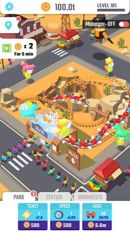 Idle Roller Coaster – занимательная игра на андроид, где вы будете создавать собственный парк развлечений. В своем парке вы будете строить различные по сложности аттракционы и приглашать в него новых посетителей. Начните с небольших горок и каруселей и закончите экстремальными видами, которые будут приводить посетителей в восторг. Развивайте и расширяйте свой парк и достигните мировой известности и славы. Продавайте еду и напитки на территории парка и получайте дополнительную выгоду и деньги, которые вы сможете потратить на постройку новых развлечений. Играйте в эту игру и наслаждайтесь отличной графикой, многочисленными объектами и простым управлением.