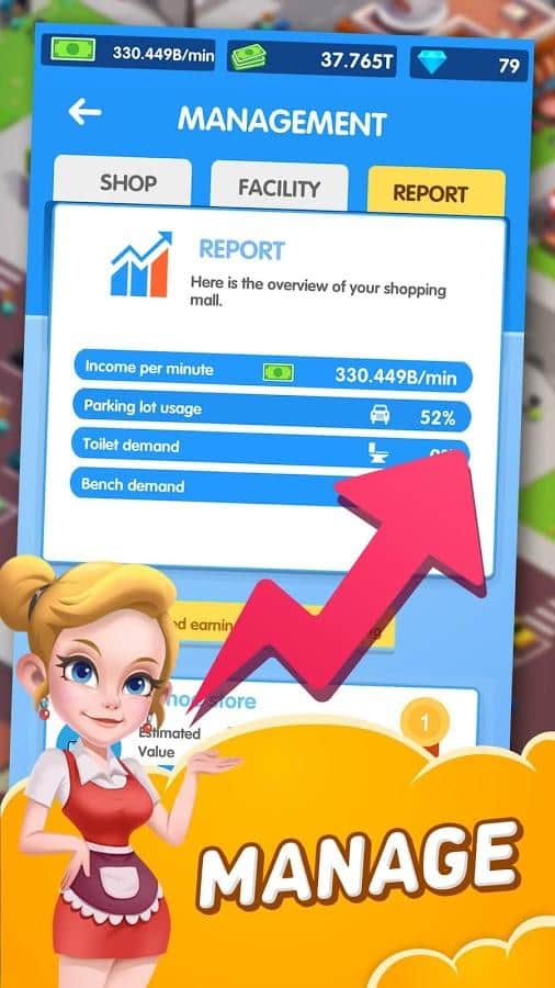 Idle Shopping Mall – игра-кликер на андроид, где вы будете управлять собственным торговым центром. Начните свой бизнес с небольшого кафе и постепенно расширяйте его до огромного торгового центра. Зарабатывайте деньги и открывайте магазины, пекарни, рестораны и другие нужные людям отделы. В вашем распоряжении будет более 400 видов магазинов. В своем торговом центре вы сможете разместить множество отделов и товаров чтобы каждый посетитель смог найти то что ему необходимо. Расширяйте и всеми способами улучшайте свой бизнес и привлекайте новых клиентов удобными лавочками и комфортными туалетами. Кликайте как можно чаще на экран своего телефона или планшета и становитесь крупнейшим магнатом.