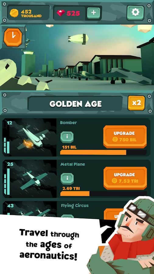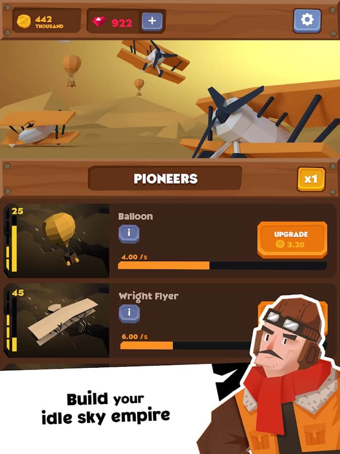 Idle Skies - аркадный кликкер с элементами исследовательской стратегии в которой вам предстоит отправиться в увлекательный мир воздушных судов и постараться развить свое предприятие от создания простеньких бипланов до строительства современных реактивных самолетов. Широкий выбор техники, система развития, полная поддержка русского языка все это понравиться поклонникам стратегий и любителям авиации.