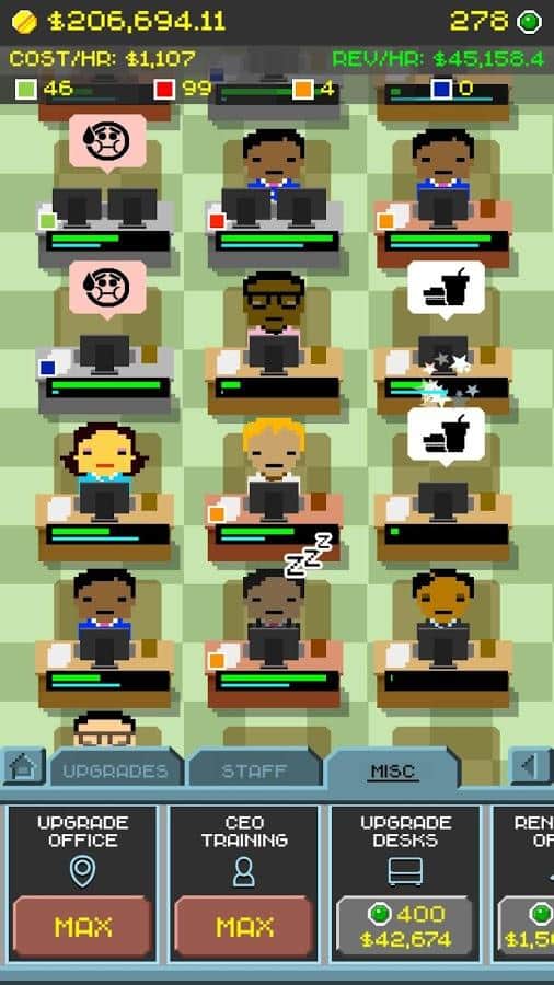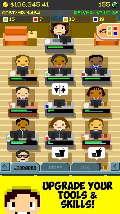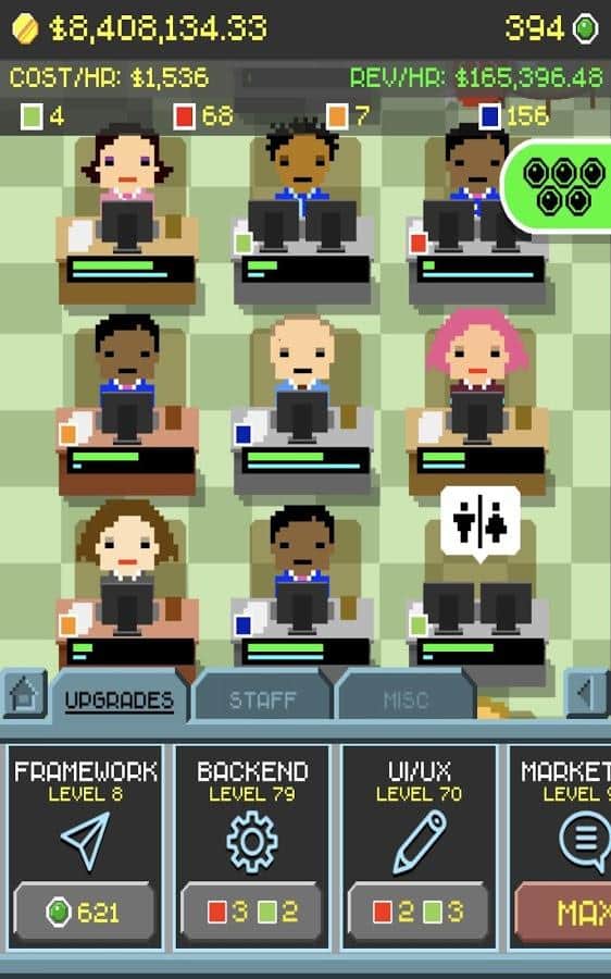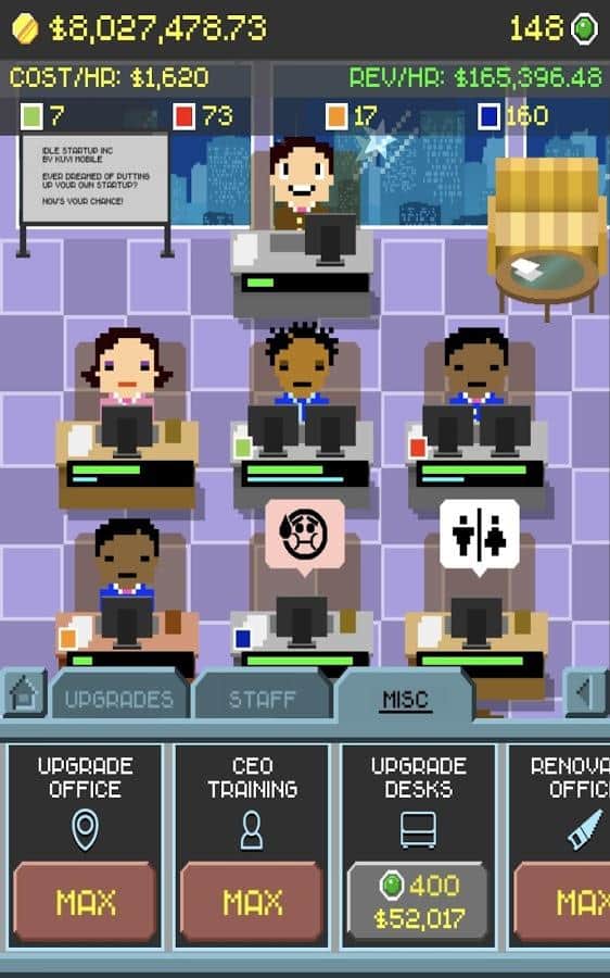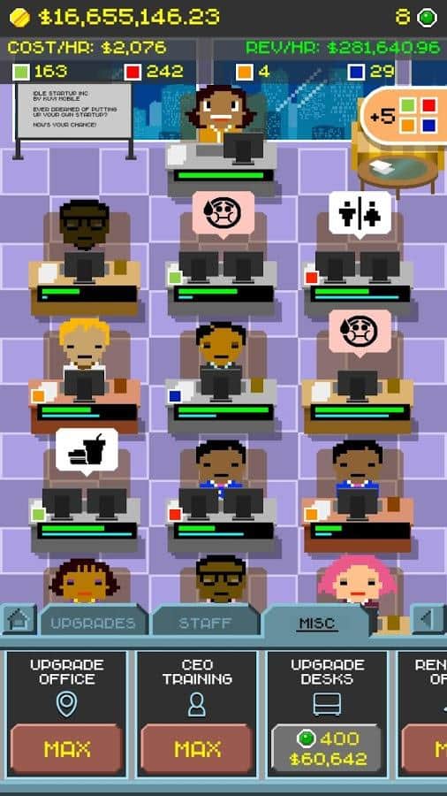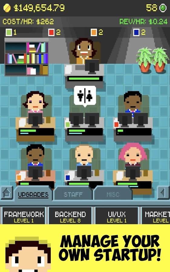Наверняка рано или поздно вы задумывались о своем деле, которое достигло бы высот и успеха. Но не всегда такая возможность бывает, все требует начинающего капитала и работников. В игре Idle Startup Inc вы виртуально научитесь какого это - начать первый в своей жизни стартап и управлять им. Соберите команду из лучших людей, постоянно улучшайте возможности и инструменты, придумывайте гениальные идеи для продаж определенных предметов, пройдите огромный путь с нищеты до богатства, попробуйте играть в сложном режиме и наслаждайтесь пиксельной графикой.
