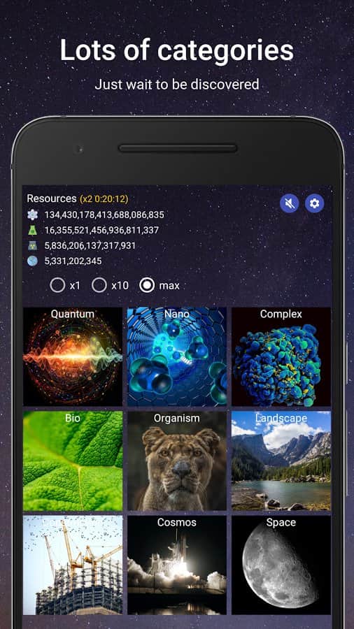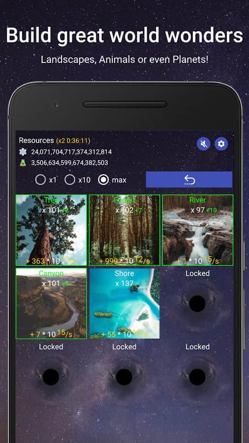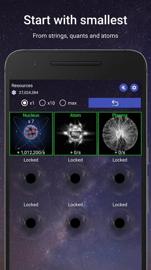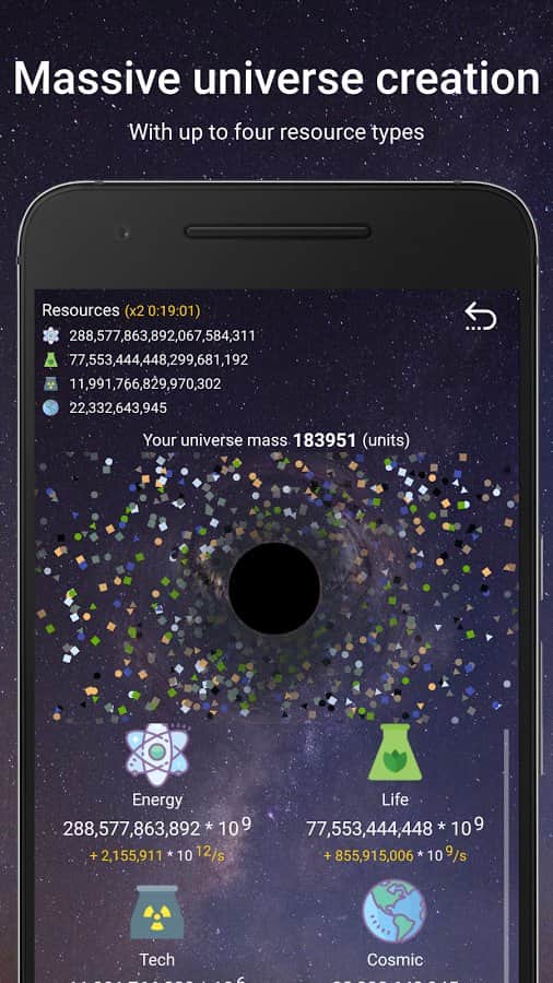 Idle World – увлекательная игра на андроид, где вы будете строить свой мир, начиная от мельчайших частиц до огромной галактики. Вашей главной задачей будет получать энергию, которая нужна вам для создания мельчайших квантовых частиц и микроорганизмов, из которых в дальнейшем вы сможете создавать человека, звезды и планеты. Выращивайте величайшую вселенную и применяйте черные дыры для создания более мощной и могущественной вселенной. Игра порадует вас уникальной игровой механикой, где вы сможете прогрессировать, даже когда вы не играете. Создавайте человечество и позволяйте им строить огромные города и космические корабли, покоряя галактику.