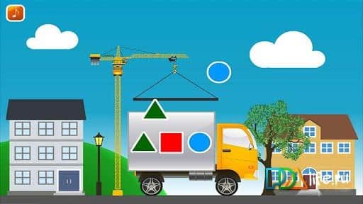 загрузи машинку - на строительную площадку приехала машинка, которую нужно загрузить 3мя геометрическими фигурками - каждую фигурку на свое место. Как только это будет сделано - машинка уедет - есть несколько машинок и локаций