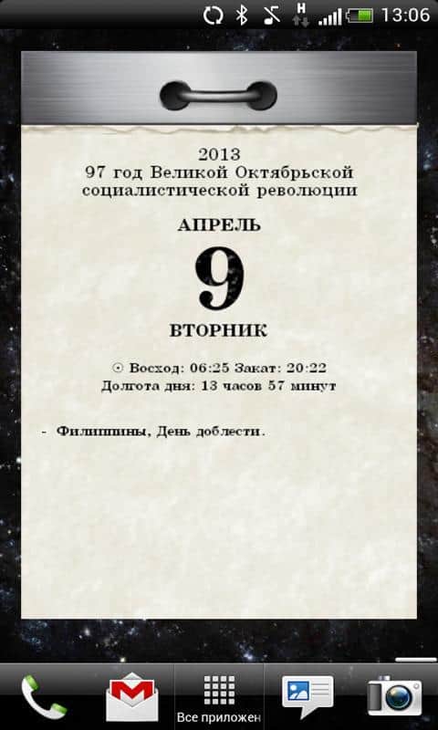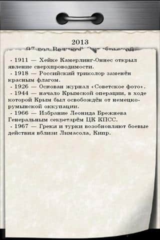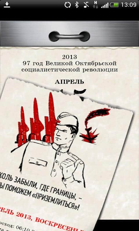 Иллюстрированный отрывной календарь эпохи 70-х – отличное приложение для вашего андроид устройства, от разработчика Doniss Ltd, которое окунет вас в эпоху давно ушедшего времени. Календарь оформлен в стиле Великой Октябрьской Социалистической Революции. Все будет как в 70-х, каждый день отрываем по листочку, читаем о дне и прочую полезную информацию на день. В настройках можно настроить синхронизацию восхода солнца, так же вставить свои праздники/события и многое другое. Так же данное приложение интегрируется с гугл-календарем.