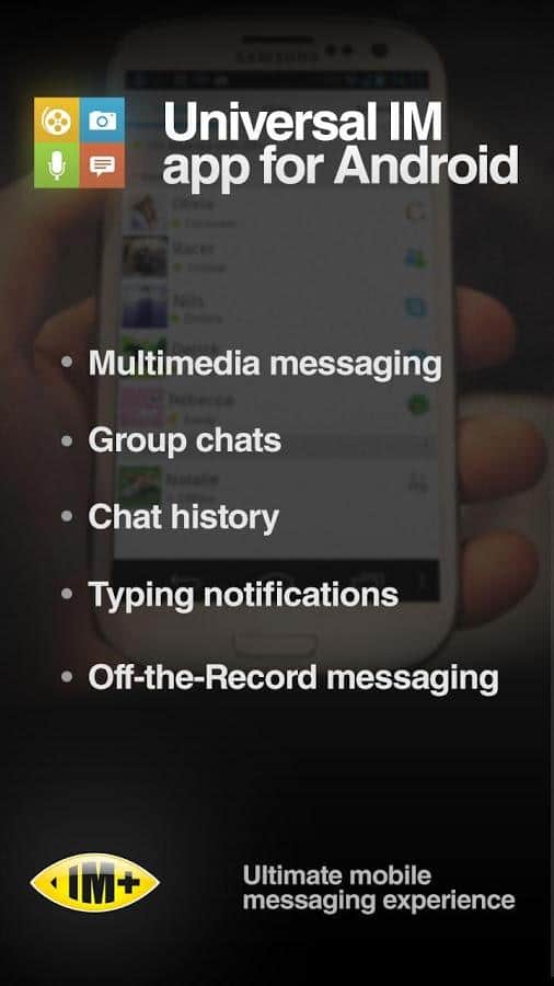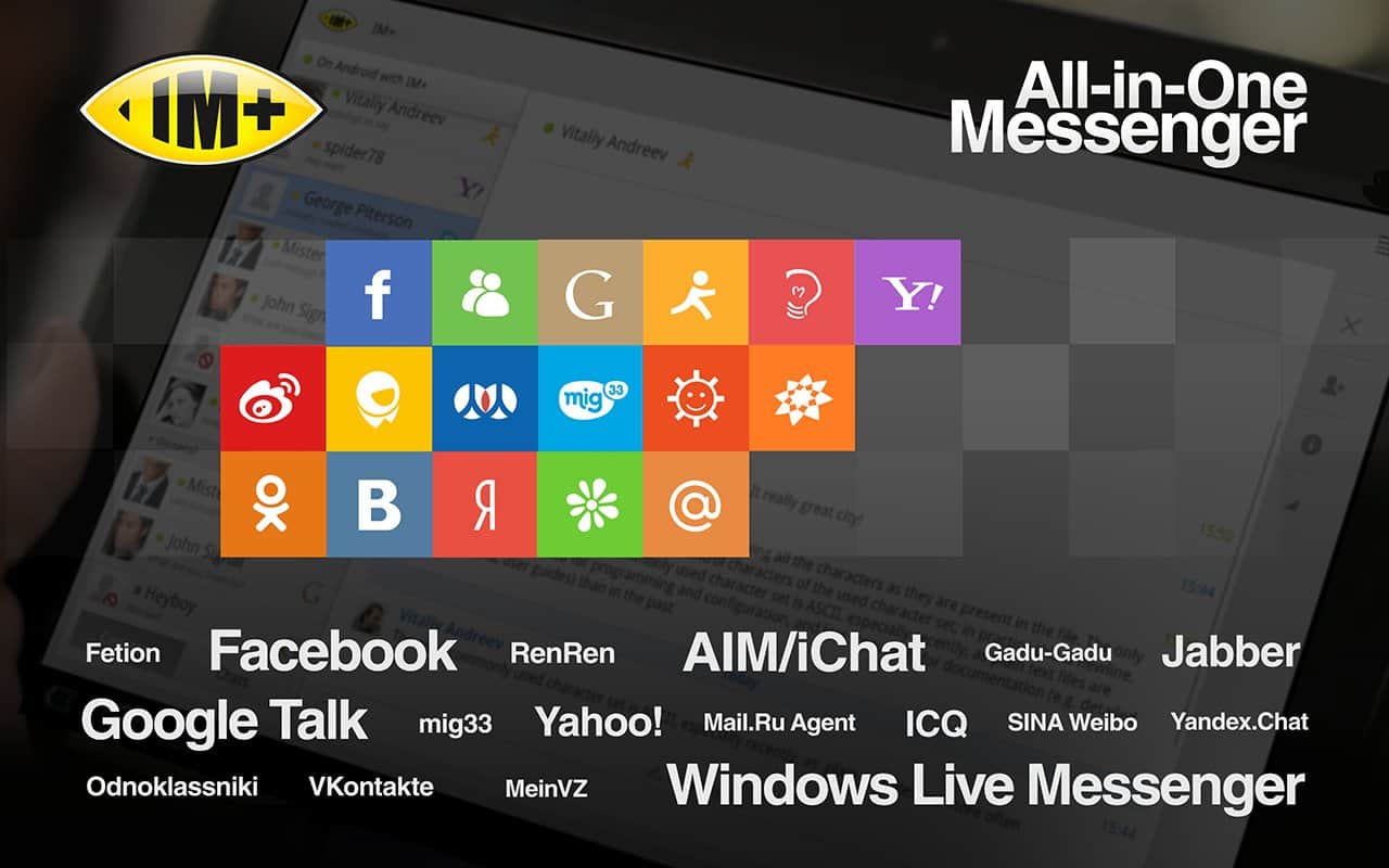 IM+ для андроид - у вас все есть, но такого интернет- пейджера вам недоставало? Общайтесь со своими друзьями и коллегами через интернет прямо со своего коммуникатора. Отличное приложение, которое способно поддерживать следующее Beep, Skype, ICQ, ВКонтакте, Mail.Ru Агент, Одноклассники, AOL, Google Talk, Yahoo!, MSN, Jabber и другие интернет возожности.