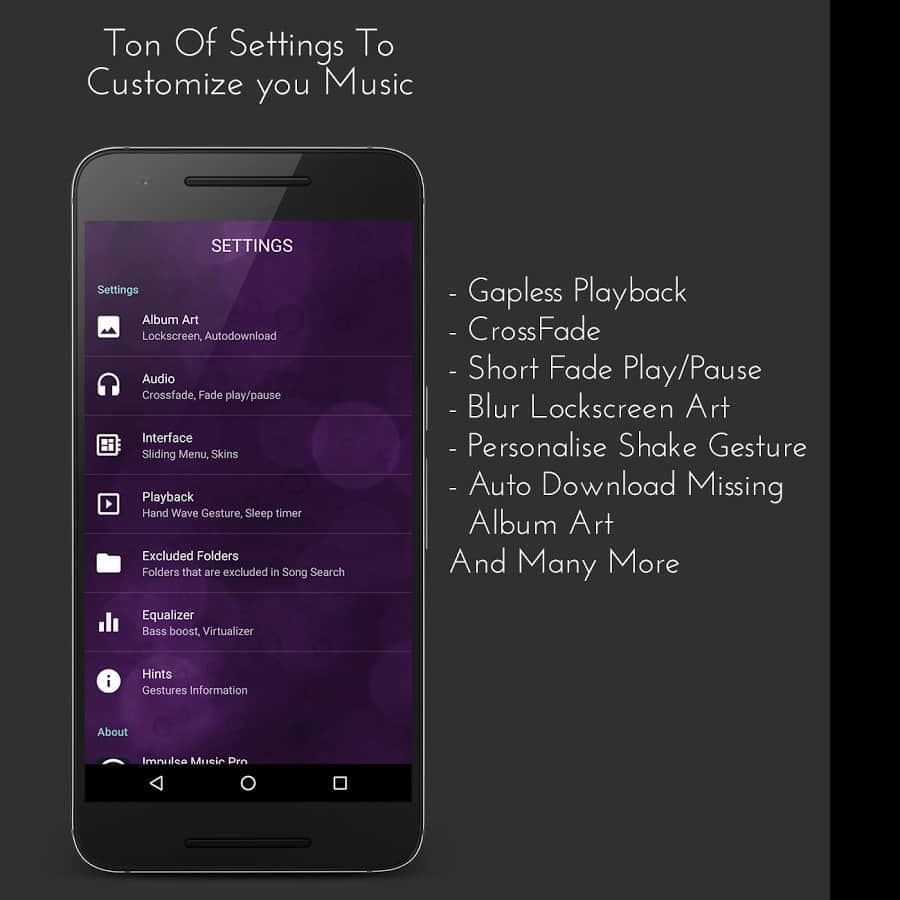 Impulse Music Player Pro - Простой и удобный музыкальный проигрыватель, с множеством дополнительных настроек и функций. Данное приложение это обычный музыкальный проигрыватель, но как и все остальные он имеет свой уникальный стиль. Так же в паре к стилю, он имеет в себе уйму функций по настройке звука. С помощью простого управления вы сможете оптимизировать свои действия, и всего одним тапом переключать песни, или же настраивать звук. Простота и функциональность, вот главное что есть в этом проигрывателе.