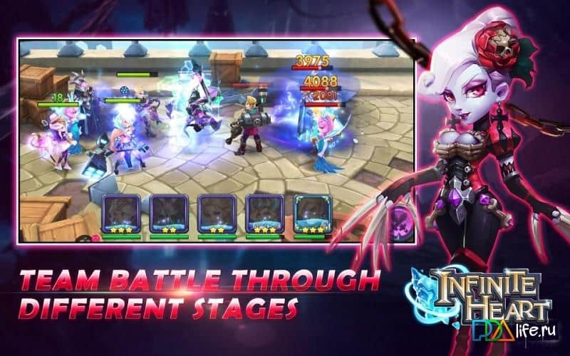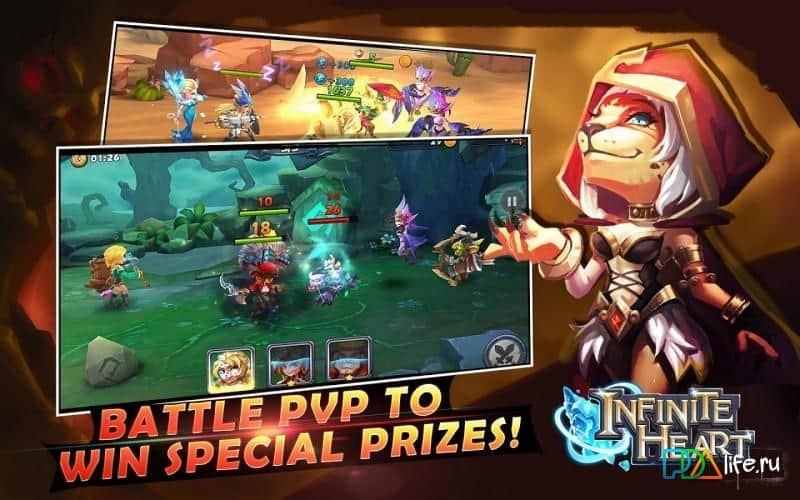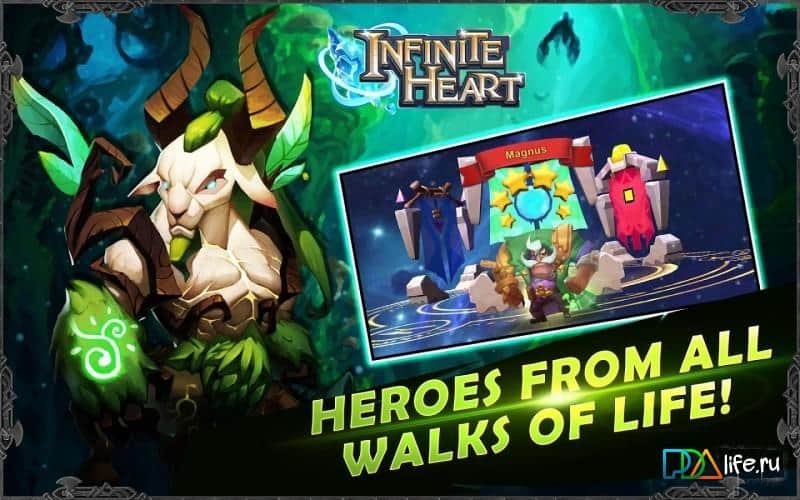 Infinite Heart – соберите свою непобедимую команду героев и путешествуйте по огромному миру, сражаясь с врагами. Сформируйте команду состоящую из мифических существ, отважных героев и воинов, каждый из которых обладает уникальными умениями и оружием. Вступайте в схватки с врагами и применяйте способности всех героев, разрабатывая свою стратегию. Защитите свой мир от уничтожения и победите ужасных врагов. По ходу игры пополняйте свою команду новыми героями и не забывайте усиливать их способности и приобретать новое оружие и обмундирование. Бросайте вызов сильнейшим игрокам со всего мира и сражайтесь с ними на арене, за победу получая ценные призы.