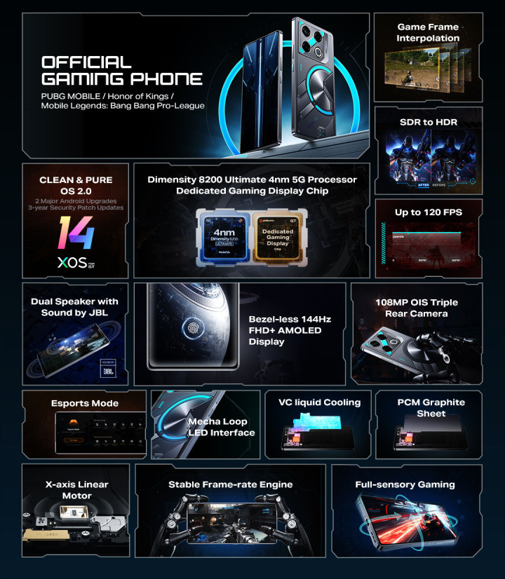 Внешность Infinix GT 20 Pro получилась броской и узнаваемой, задник украшен RGB-подсветкой, которая может использоваться для уведомлений и изменения статуса смартфона, а также активно используется в некоторых поддерживаемых играх, в частности, PUBG, MLBB и Free Fire.