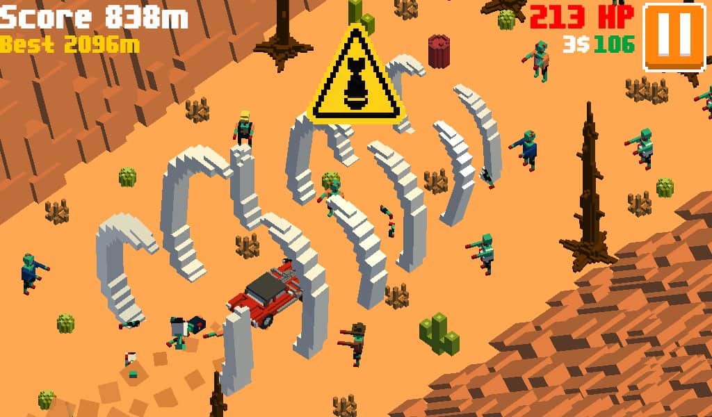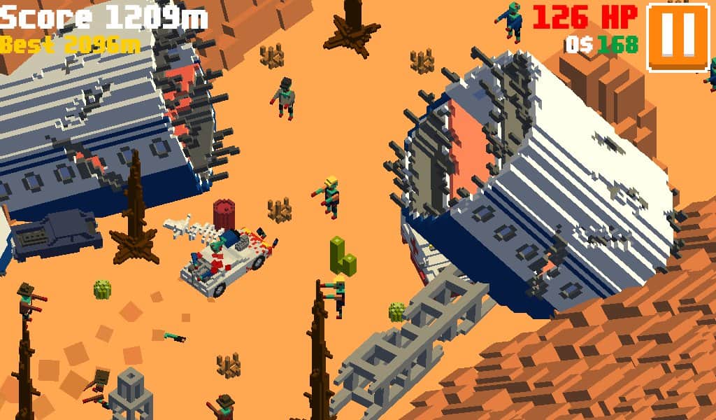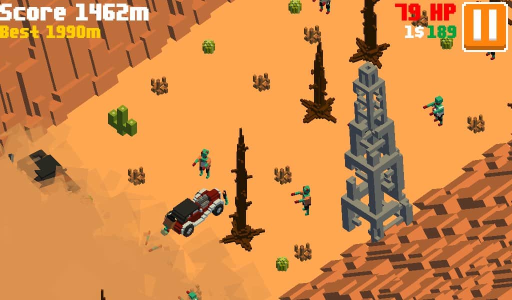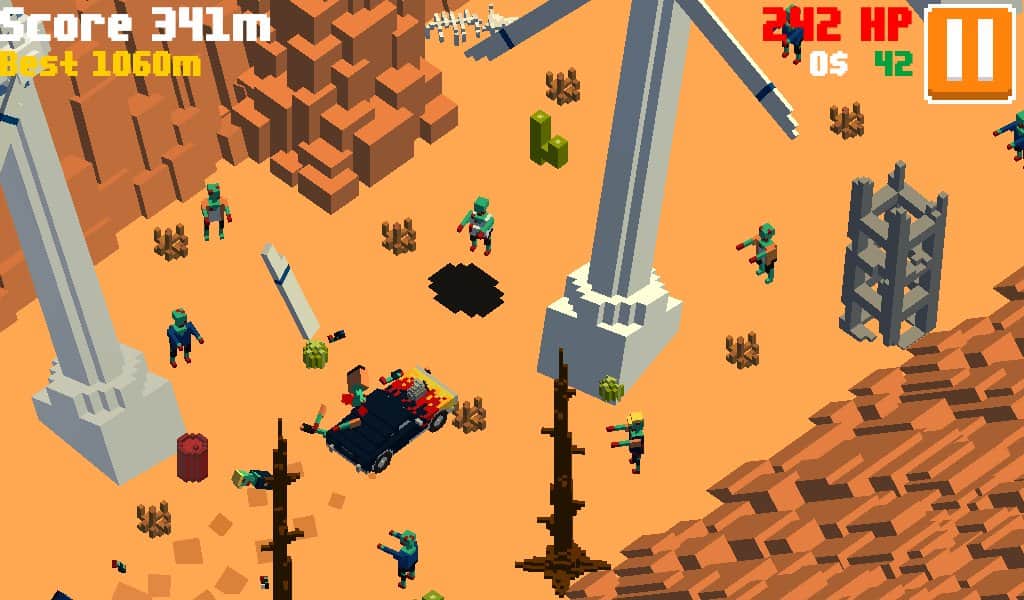 Insane Road - Zombie Desert – увлекательные гонки на андроид, где вы будете гонять по пост апокалиптическому миру. Садитесь за руль необычного автомобиля и проведите его по знойной пустыне заполненной преградами, руинами и кровожадными зомби. Эта игра порадует вас случайным образом генерируемыми уровнями, красивыми пейзажами в ретро графике и многочисленными автомобилями. Продержитесь как можно дольше в этой игре, преодолевая большую дистанцию и устанавливая рекорд. Открывайте для себя все автомобили игры, начиная от бронированных внедорожников и заканчивая спортивными автомобилями.