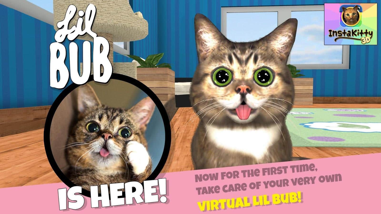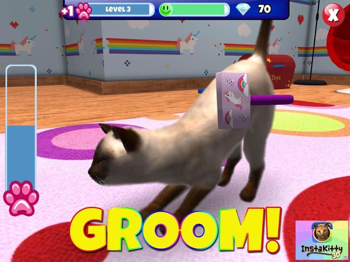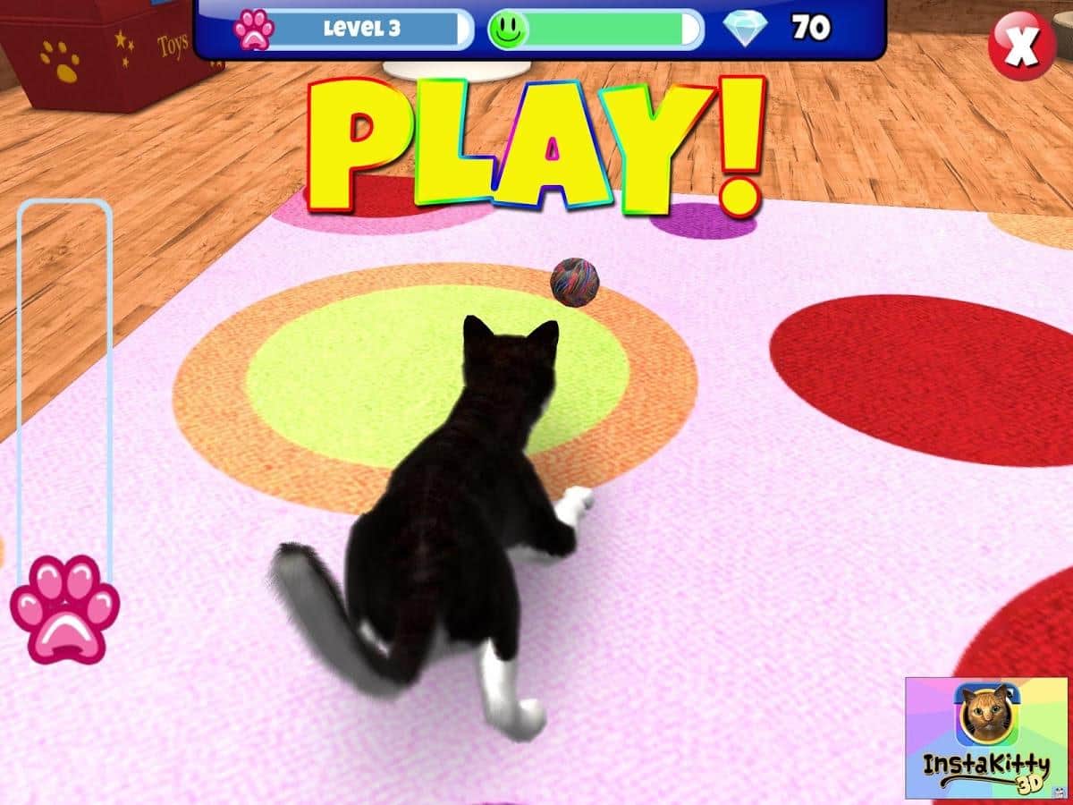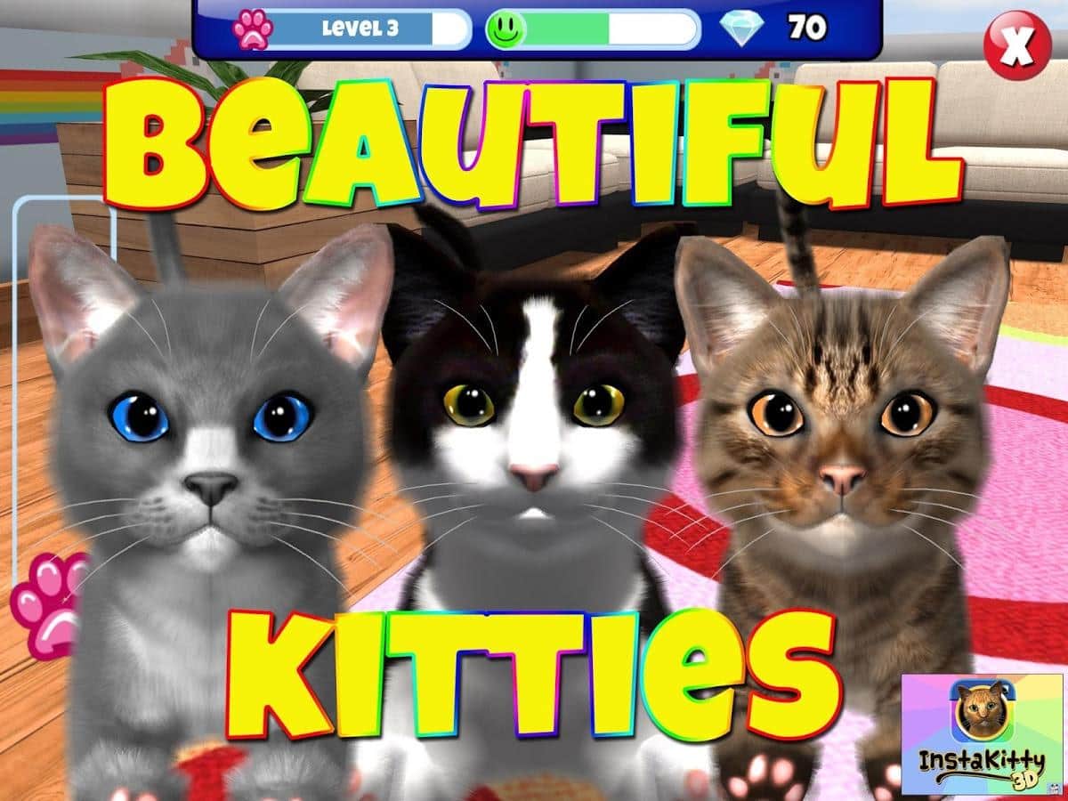 InstaKitty 3D – Откройте для себя одну из самых самую красивых и реалистичных симулятор кота. Получайте в подаврок своего собственного кота, назовите его, и сделать его частью вашей повседневной жизни. Кормите его, играйте с ним и делайте всё , чтобы вы делали с настоящим котом. Можно делать отличные фото и коллажи вместе со своим четвероногим другом, одевать на него различные одежды. Танцевать и многое другое. Так-же своим питомцем можно поделится с друзьями через социальные сети. Помимо этого можно изменять декорации вашей комнаты: обои, мебель, ковры и многое другое.