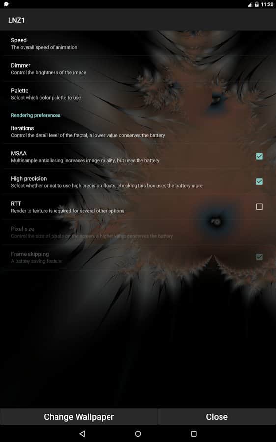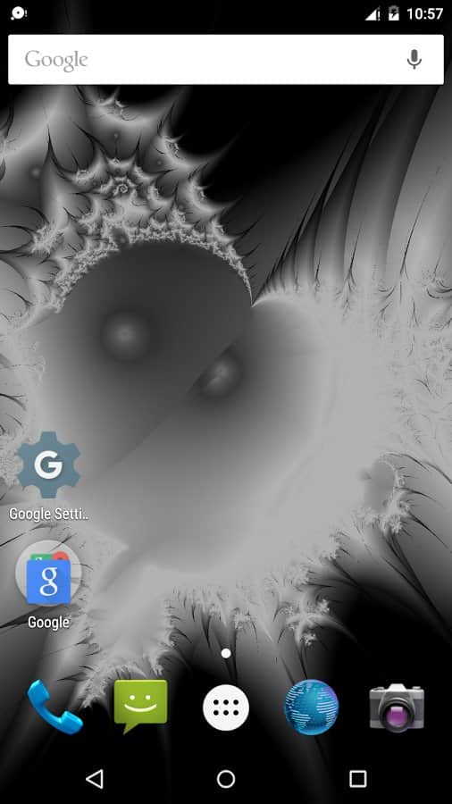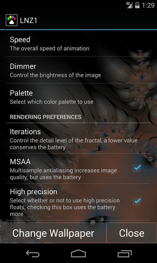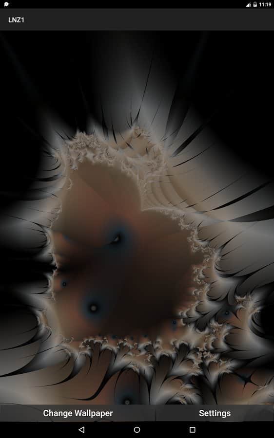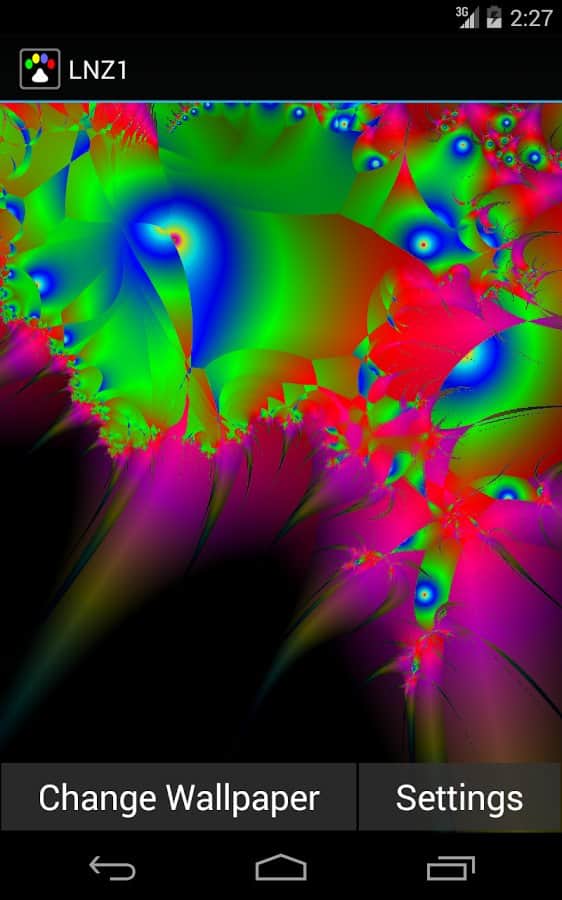 Interactive Fractal Wallpaper – живые обои на андроид, где вы сможете наблюдать множество одинаковых частиц и объектов. Такое свойство частиц и объектов называется – фрактал, когда огромное скопление одинаковых объектов различающихся по размерам находятся в одном месте. Такое свойство частиц вы и сможете наблюдать на экране своего телефона или планшета, если установите эти живые обои. С помощью настроек вы сможете менять цвет, количество и свойство фрактала, а также с помощью одного прикосновения пальца сможете изменить масштаб изображения. Наслаждайтесь завораживающим зрелищем на вашем экране и получайте удовольствие от многочисленных красок.