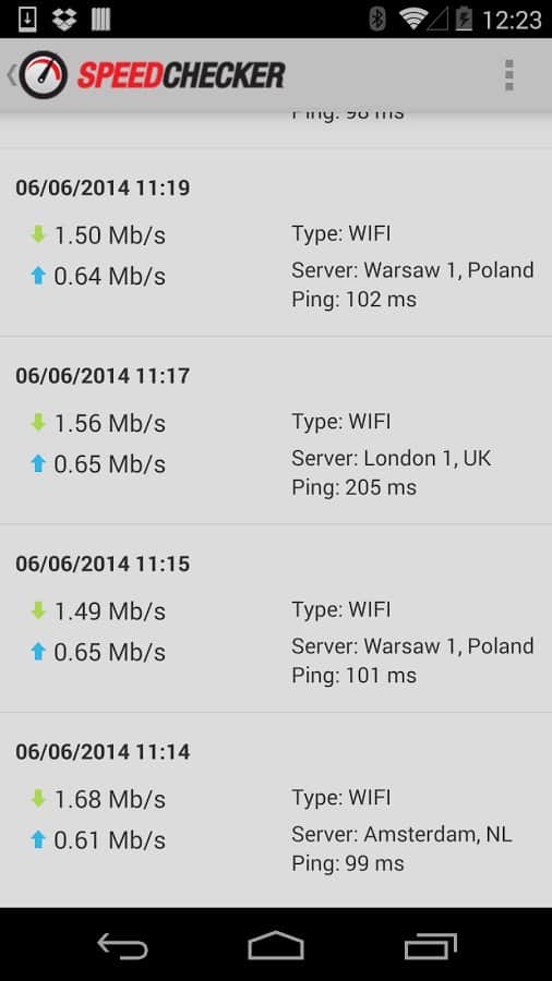 Internet Speed Test - Хотите точно знать скорость своего интернет соединения, или же проверить его качество? Установите это простое приложение, и всего через несколько секунд вы будете знать о качестве связи с любым уголком в мире! Все очень просто, вы запускаете приложение, выбираете регион с которым нужно проверить соединение, и жмете старт, за пару мгновений это приложение соберет вам всю нужную информацию, и выдаст её в простой и понятной форме. Так же, вы можете просматривать историю своих проверок и точно знать стало ли качество лучше или хуже.