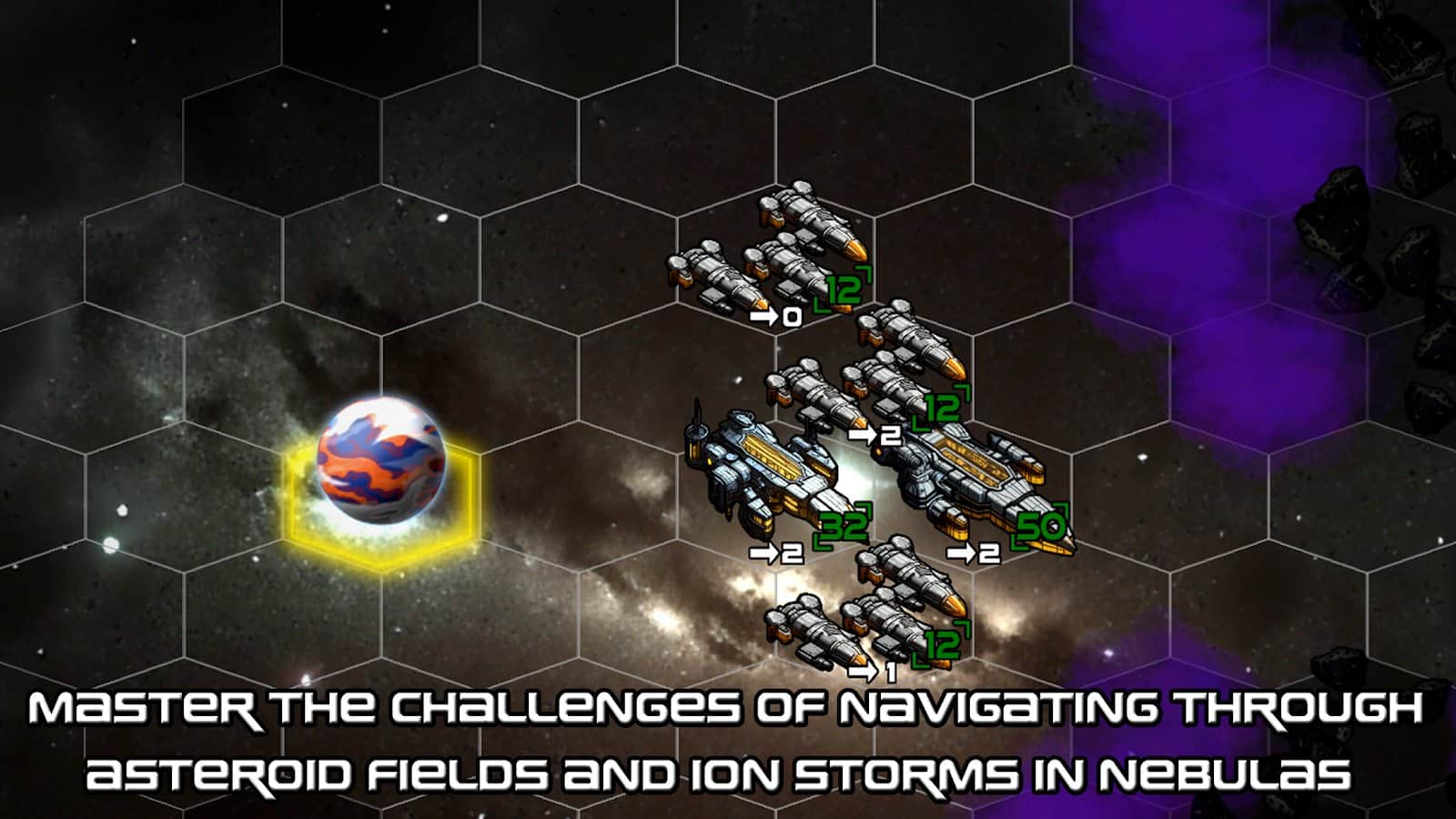 Вступайте в захватывающее путешествие по галактике в этой захватывающей пошаговой стратегической игре, где вы возглавляете флот космических кораблей и исследуете неизведанные уголки космоса. Ваша цель завоевать и контролировать множество планет, каждая из которых предлагает уникальные возможности и вызовы. Решайте сложные задачи навигации, сражаясь с астероидными полями и ионными бурями в туманностях. Выберите свой путь: использовать их в своих интересах или найти убежище от врагов. Проявите свою стратегическую гениальность, размещая рынки и фабрики на контролируемых вами планетах, чтобы перехитрить своих соперников. Выберите одну из трех могущественных космических фракций, каждая из которых обладает уникальными преимуществами и характеристиками.