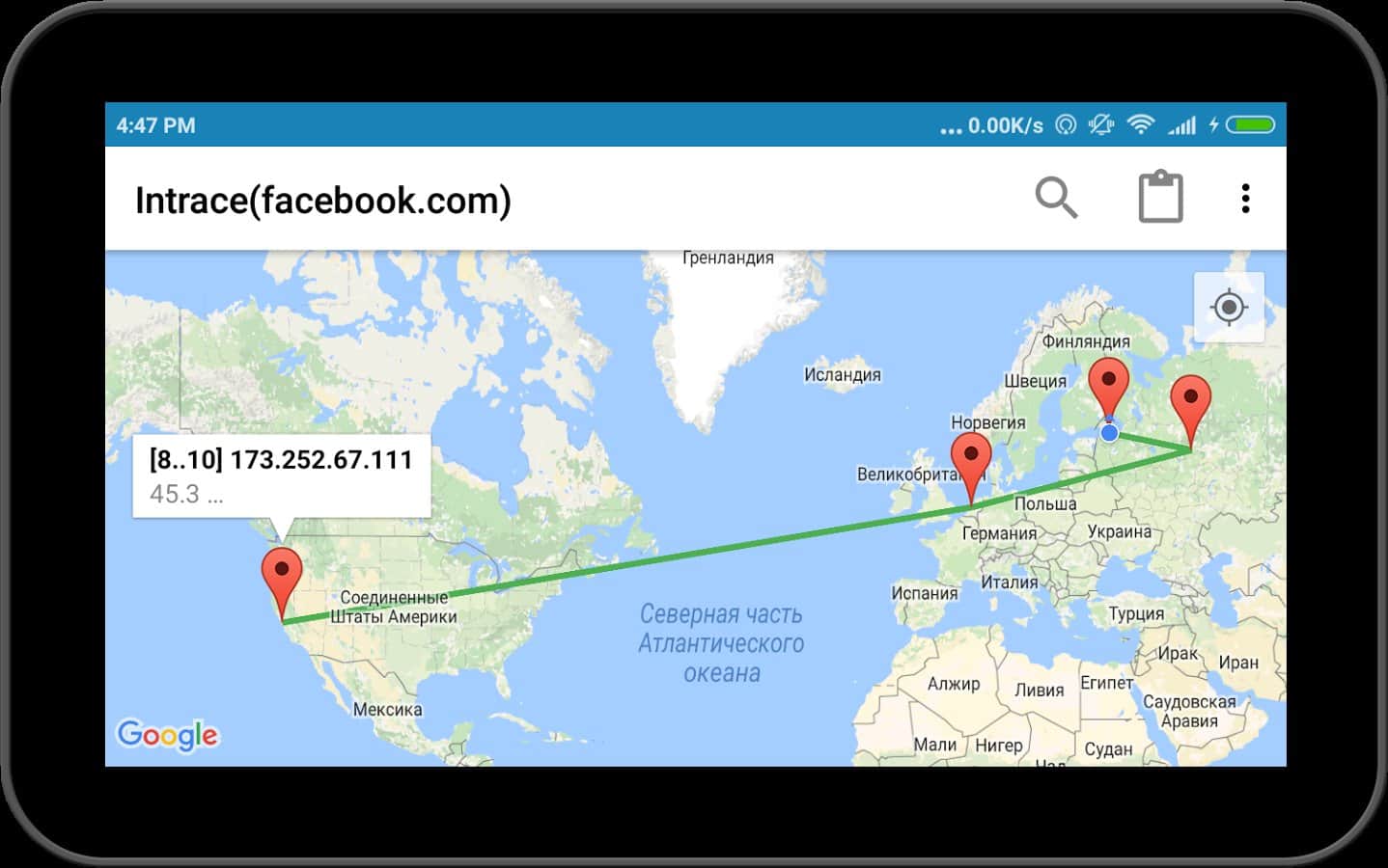 Intrace – приложение позволяющее узнать. Каким маршрутом следуют данные в сетях. С помощью этой нехитрой программы можно вычислить маршрут движения ваших данных и определить через какие города, dns сервера и компьютеры они проходят при обращении вами к определённому сайту или другому источнику информации, которая подразумевает выход в интернет. Приложение будет полезно сетевым инженерам, администраторам сетей и другим пользователям, которым интересно узнать по каким каналам идёт трафик.