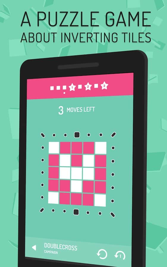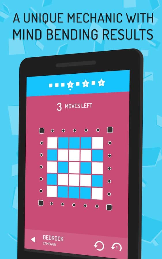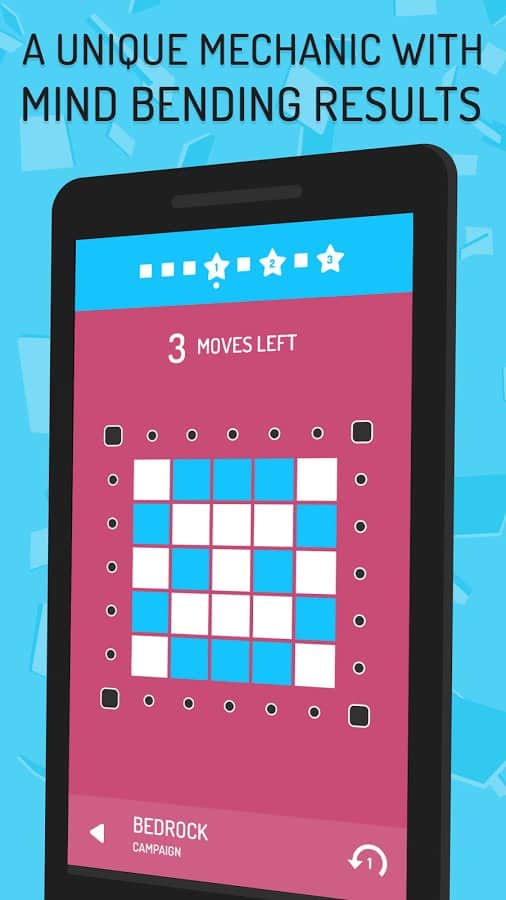 Invert - A Minimal Puzzle Game – отличная головоломка на андроид, где вы будет окрашивать плитки в один цвет. В этой игре перед вами откроется поле, на котором размещены плитки и вашей задачей будет переворачивать их так, чтобы они окрасились в один цвет. Решение таких задач не займет у вас много времени, если вы будете тщательно продумывать каждый свой шаг и проходить уровни, тратя как можно меньше ходов. В игре вы найдете три режима игры: