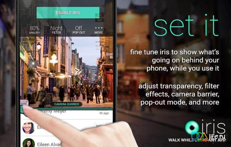 Те, кто любит передвигаться по дому или улицам не отрываясь от телефона наверняка порадовались бы возможности сделать свой телефон прозрачным. Частично эту проблему решает представленное приложение. Оно запускает камеру и делает интерфейс запущенных приложений полупрозрачным, а значит вы можете переписываться с друзьями или листать ленту новостей не рискуя наткнуться на предметы или людей, оказавшихся на вашем пути. В настройках программы можно выбрать уровень прозрачности и отрегулировать, какая часть экрана будет транслировать изображение с камеры.