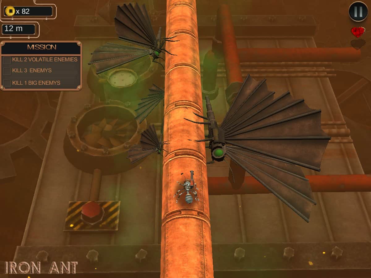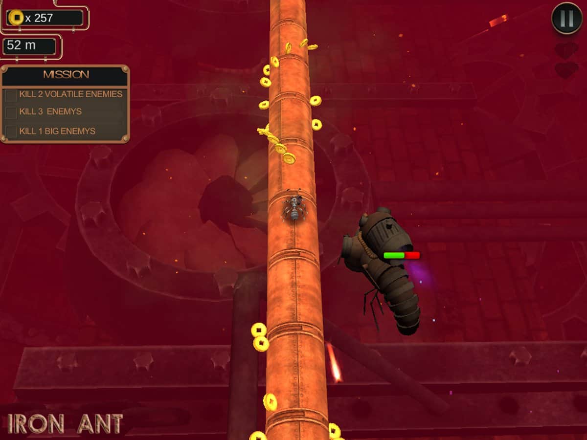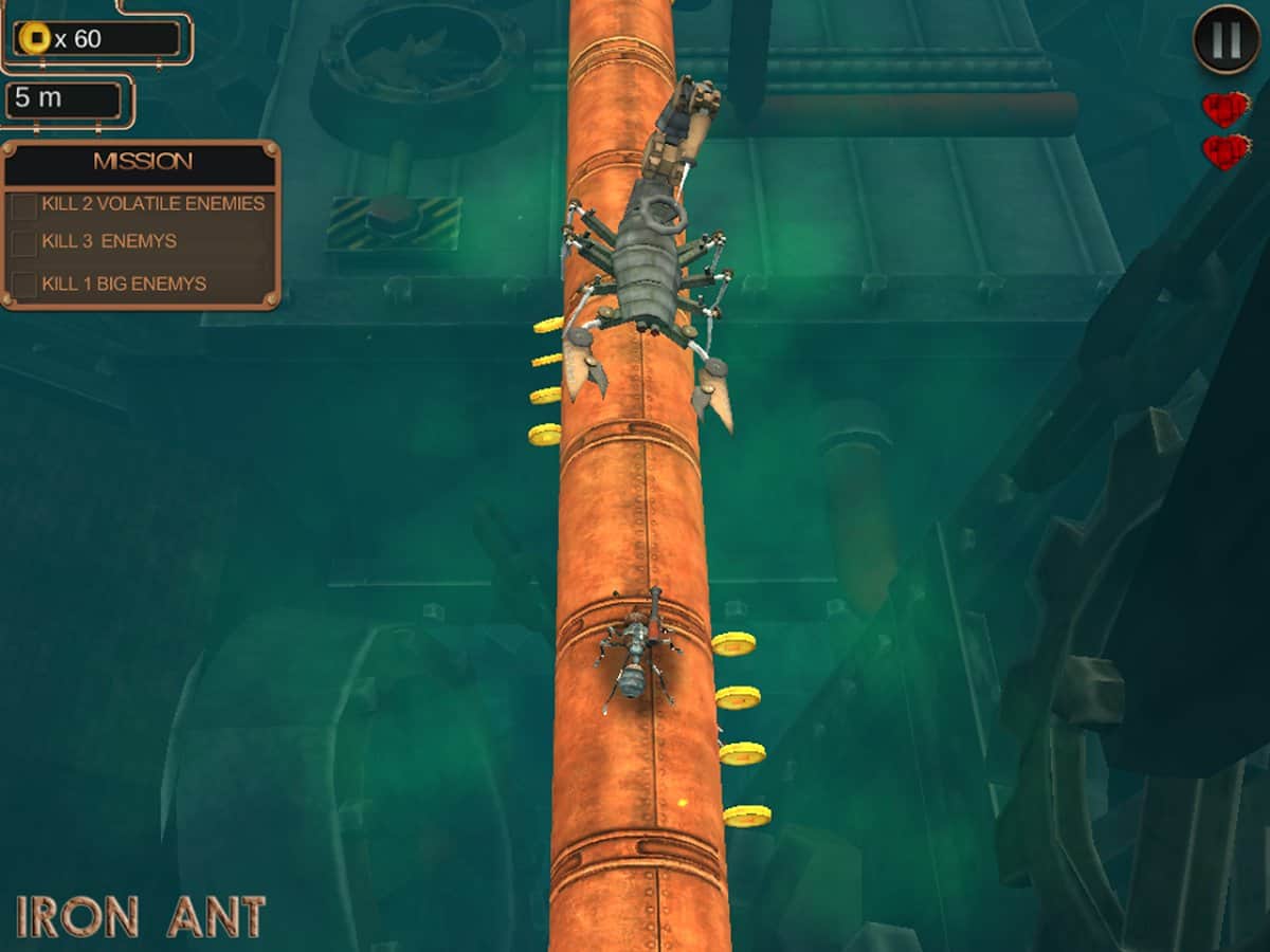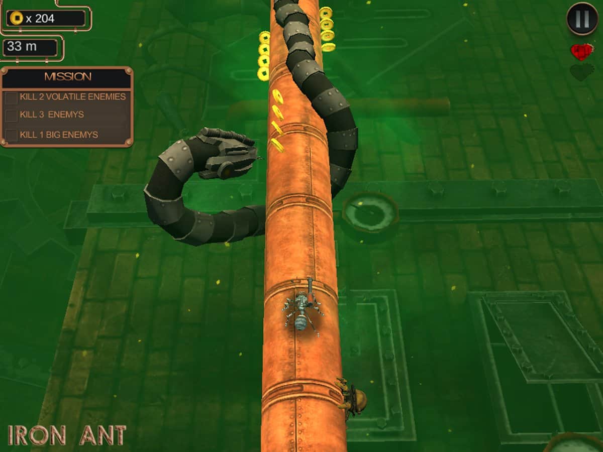 Iron Ant - An ant surviving against death – игра на андроид, где вы перенесетесь в удивительный мир где обитают механические насекомые. В этой игре вы возьмете под свой контроль механического муравья и проведете его по узкой трубе стараясь обходить все преграды на пути. Наш герой отправился в опасное путешествие, стараясь отыскать новые земли для своего народа. На своем пути вы встретите множество преград и препятствий, а также врагов в виде гигантских стрекоз и пауков. Нажимайте на разные стороны экрана для того чтобы вращать трубу по которой бежит муравей, а также нажимайте на летающих и ползающих противников уничтожая их. Выполняйте все миссии игры и получайте дополнительные жизни.