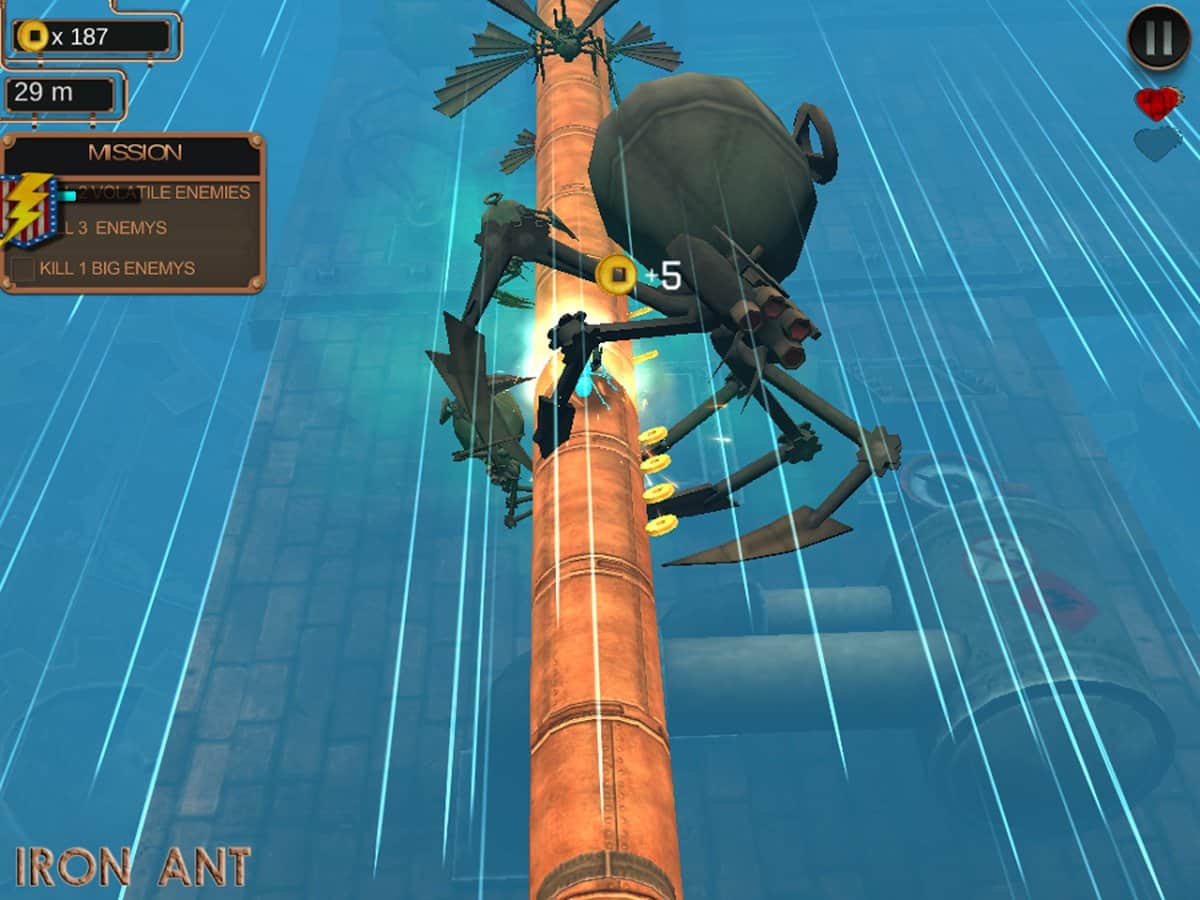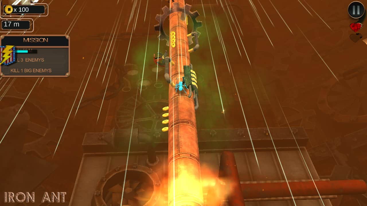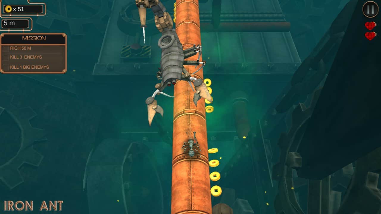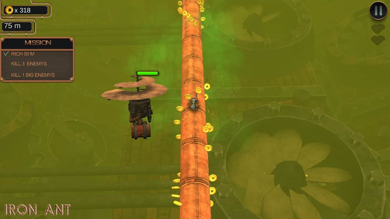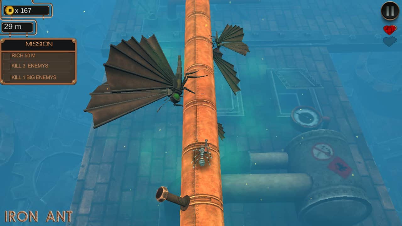 Iron Ant - An ant surviving against death – игра на андроид, где вы перенесетесь в удивительный мир где обитают механические насекомые. В этой игре вы возьмете под свой контроль механического муравья и проведете его по узкой трубе стараясь обходить все преграды на пути. Наш герой отправился в опасное путешествие, стараясь отыскать новые земли для своего народа. На своем пути вы встретите множество преград и препятствий, а также врагов в виде гигантских стрекоз и пауков. Нажимайте на разные стороны экрана для того чтобы вращать трубу по которой бежит муравей, а также нажимайте на летающих и ползающих противников уничтожая их. Выполняйте все миссии игры и получайте дополнительные жизни.