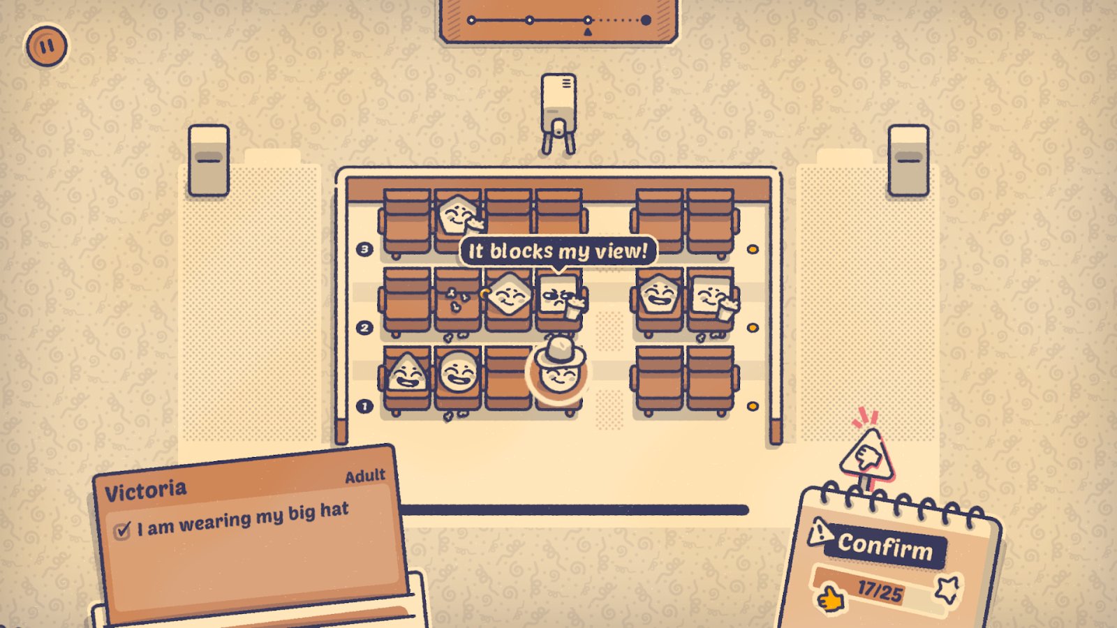 Is This Seat Taken? - каждое место имеет значение! Рассаживайте персонажей так, чтобы их привычки и желания совпадали: кто-то хочет сидеть у окна, кто-то — подальше от шума или запахов. Погружайтесь в уютные сцены — от кинотеатра до свадьбы — и открывайте уникальные истории. Без таймера и спешки вы сможете вдумчиво решать головоломки, узнавать забавные особенности героев и следить за путешествием Славы, мечтающего встретить своего кумира.