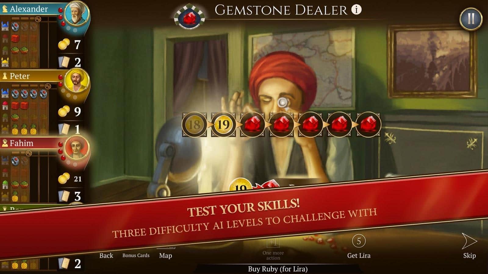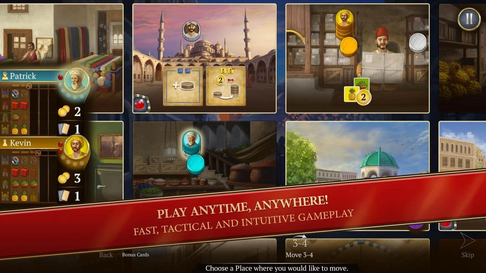 Istanbul: Digital Edition – стратегия на андроид, где вы будете управлять четырьмя помощниками и перевозить товары. В этой игре вы будете выступать в роли торговца который контролирует действия четырех помощников для того чтобы заработать как можно больше рубинов. Перемещайте своих помощников по разным уголкам Стамбула и базара и перевозите товары, зарабатывая для своего торговца монеты. По пути собирайте руины и сделайте своего торговца самым богатым человеком в Стамбуле. Перемещайте повозки по 16 различным местам на карте и делайте все как можно быстрее, чтобы обхитрить своих соперников. Обновляйте и увеличивайте свои тачки, чтобы перевести больше товаров.