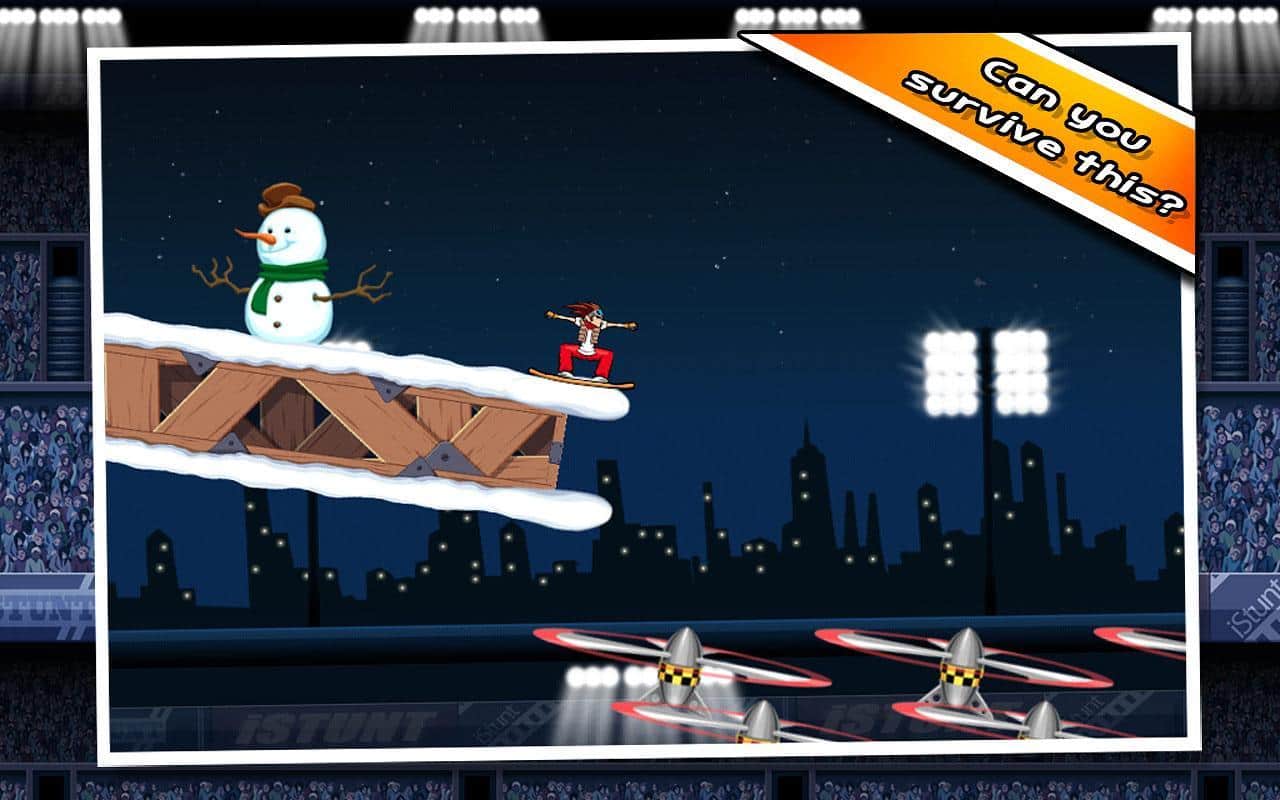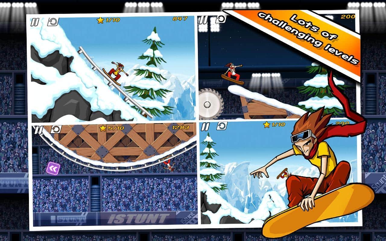 iStunt 2 - это спортивная аркада про сноубордиста - любителя острых ощущений! Экстремальное преодоление препятствий на протяжении всей трассы! На пути будут и ямы и перепады, падающие сосульки, взрывы, гравитационные поля, пилы - благодаря которым вы сможете сделать умопомрачительные трюки, полетать так сказать на славу! И при всем при этом надо устоять на доске, иначе придется начинать уровень сначала! После прохождения каждого из 40 уровней можно сравнить свои достижения с доской лидеров - а вдруг вы на первом месте? Ну и классное дополнение к игре - магазин, в котором можно приобрести современный спортивный костюм или же доску для катания! 40 треков с усложняющимися условиями - каждый уровень растет количество преград, сложность пути, а также возрастают способности главного героя!