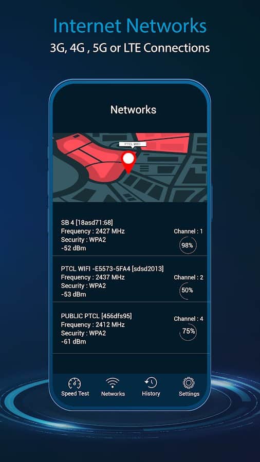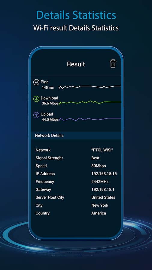 На основе вашей производительности в Интернете есть возможность сделать полный анализ скорости сигнала Wi-Fi. При получении данных в вашем распоряжении будет отображаться скорость пинга, шлюз, мощность сигнала, местоположение в сети, пользователей, которые пользуются вашим интернетом. В результате вы получите подробную статистику и информацию о сети, где включены сведения про Сеть, Силу сигнала, Скорость, Айпи адрес, Частоту, Шлюз, Город хоста сервера, Город, Страну. Следите за историей и подключайтесь к надежным источникам.