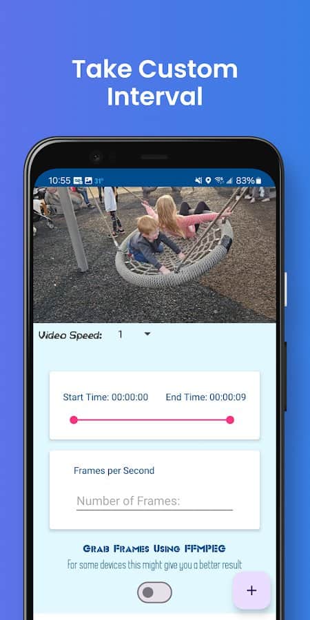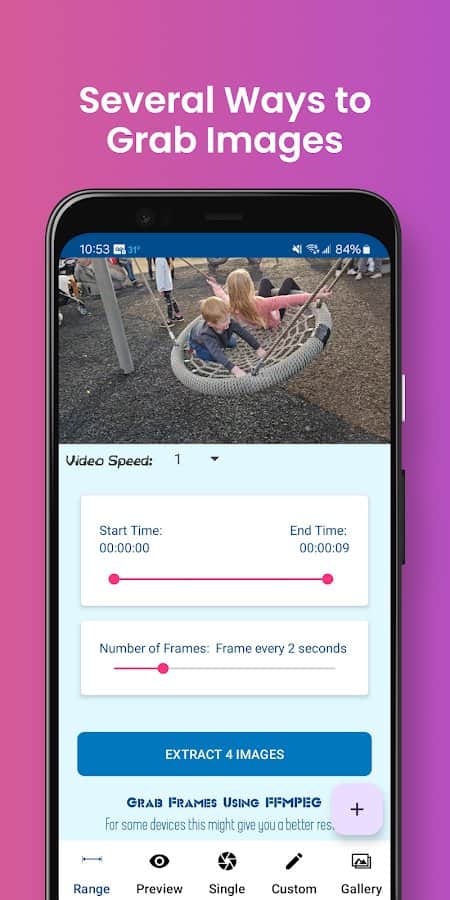 Извлечение изображений из видео - Если вам понравилось какое-то фото из просмотренного видео, или же оно вам необходимо для чего-то, но в высоком качестве, то совсем не обязательно делать снимок экрана и получать искаженную фотографию. В этом приложении вы можете просто загрузить видео, дождаться пока приложение само вытянет из него все изображения, а после запросто их скачать без какого-либо текста сверху или дополнительных спецэффектов, загруженных во время видео. Для удобности, если вам нужны не все фото, обозначьте диапазон и количество кадров.