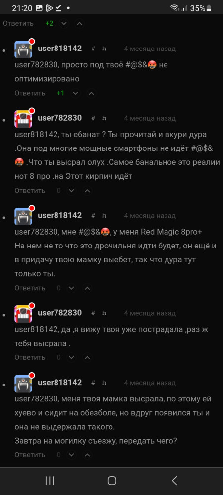 Прочитал ваши замечания, в первом случае пользователю не понравилось что ему поставили дизлайк, и он написал сам себе комментарий казалось бы, от вас было больше шума чем от него. Во втором не кормите троллей, зачем с ними вступать в конфликт и поощрять их своим вниманием, они не поймут а вам обидно. На крайней случай выясняйте отношения в лс, и не подавайте плохого примера другим. Мира и добра вам не ругайтесь )