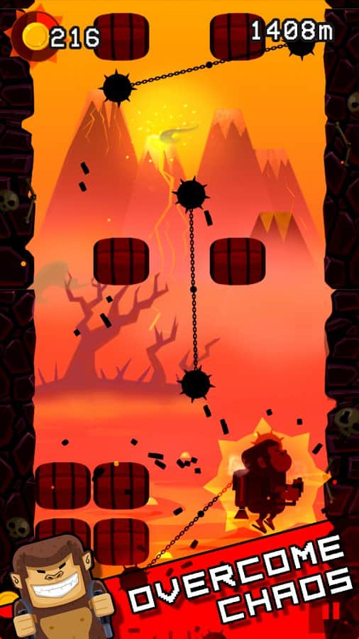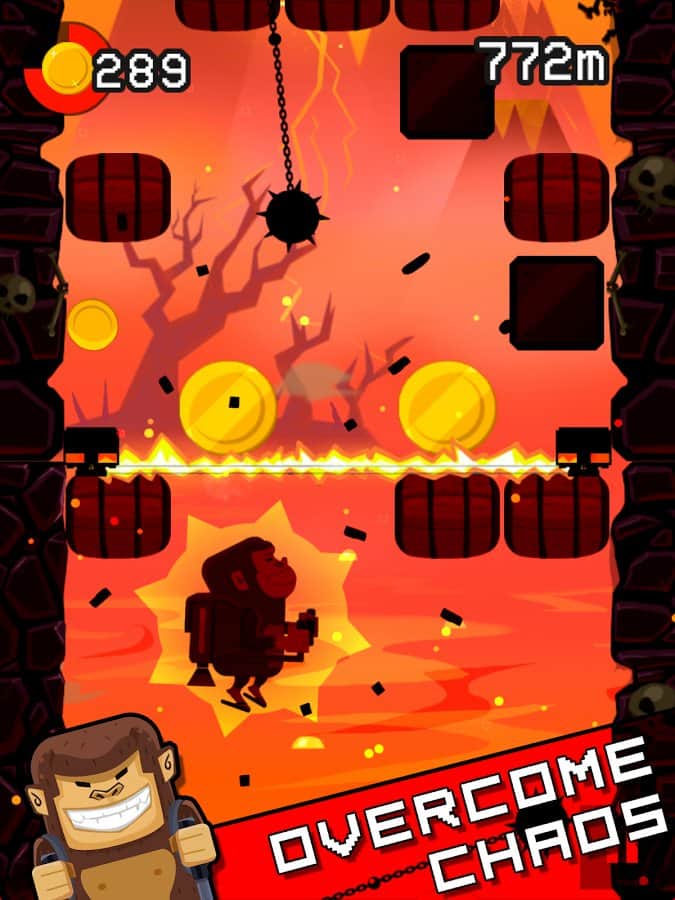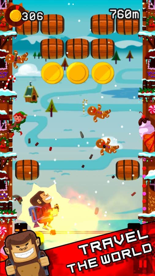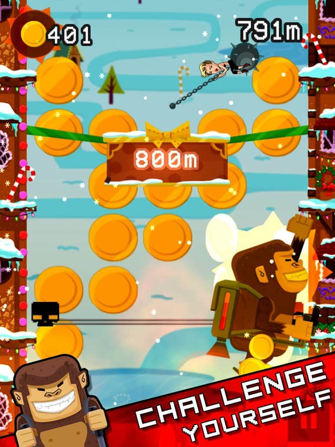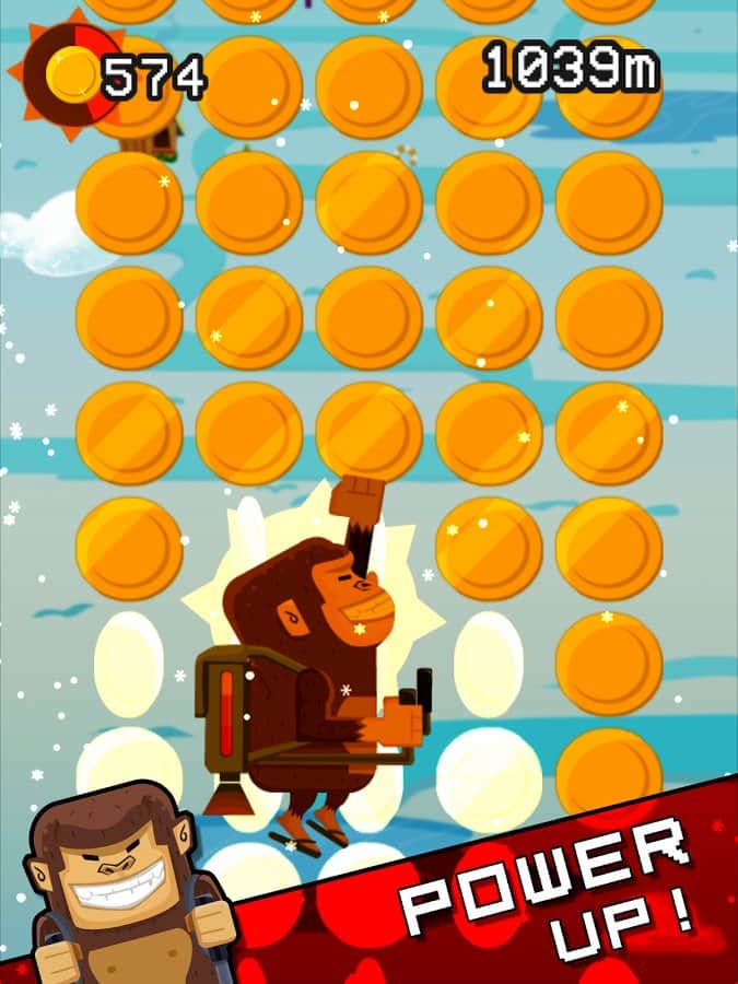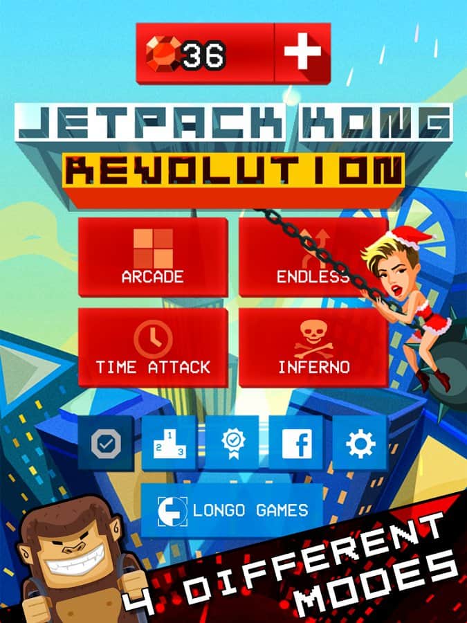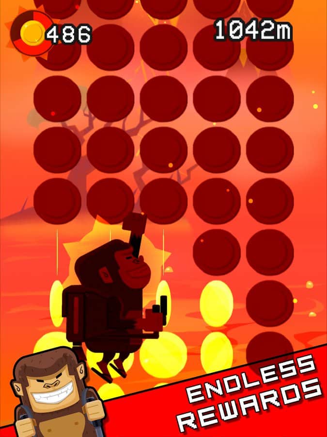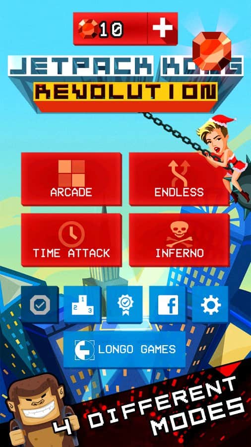 Jetpack Kong Revolution – бешенная обезьяна с реактивный ранцем летящая всё время вверх и избегающая различные препятствия порадует многих мобильных геймеров. Для начала вам необходимо сбежать с зоопарка, а потом уже думать о коварном плане о всемирном господстве. Управление простое, в две кнопки. Одна отвечает за поворот влево, другая за поворот вправо. Избегайте препятствия и различные опасности, собирайте монетки, самоцветы и другие полезные предметы. В игре представлено 4 режима игры. Каждый выберет себе тот, который ему больше нравится. Присутствует мировая таблица лидеров.