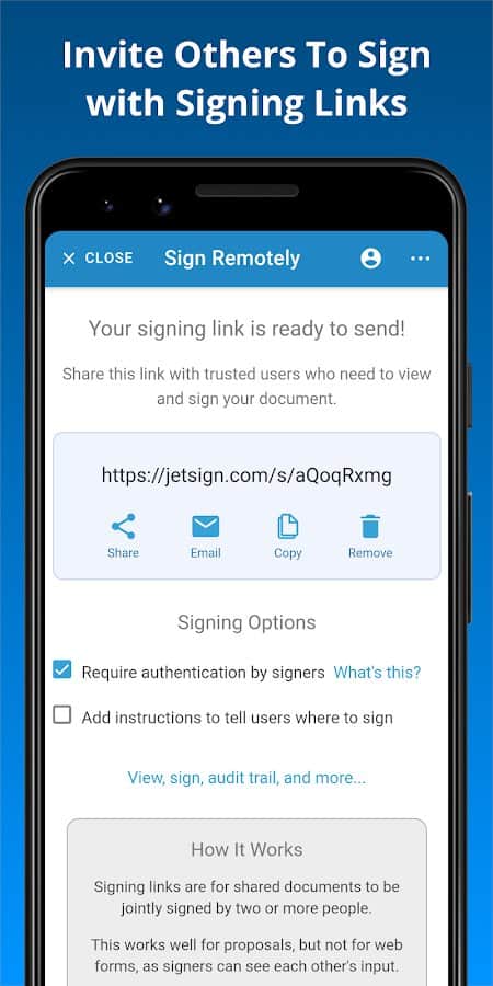 Подпись в нынешнее время можно добавить на любой документ или файл за считанные секунды, без лишних заморочек про печати и сканирования! Изменяйте размер текста, вставляйте галочки и крестики, клонируйте поля, быстро заполняйте необходимые формы и сохраняйте любые форматы файлов на собственный телефон. Отправляйте документы с вашей подписью через скопированную ссылку или по электронной почте для второй подписывающей стороны. Самостоятельно проставьте нужные инициалы, дату и место для другой подписи.