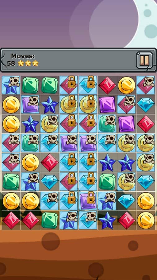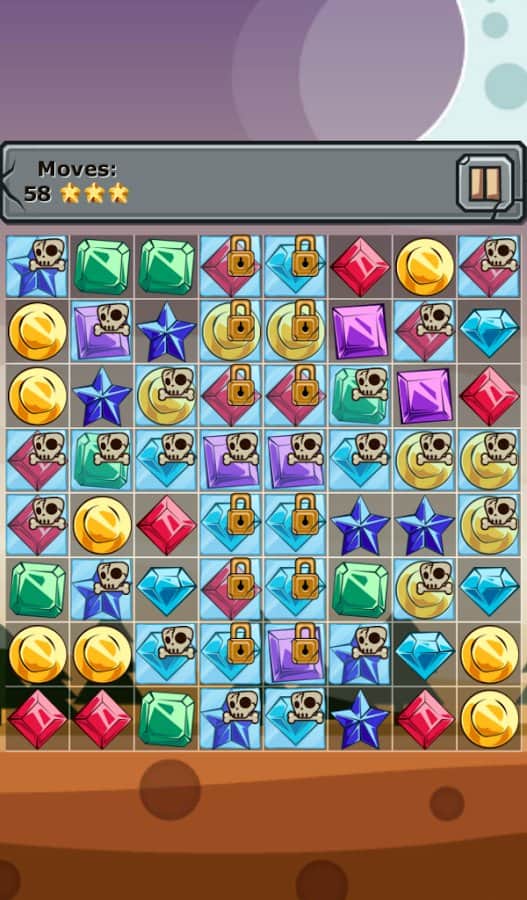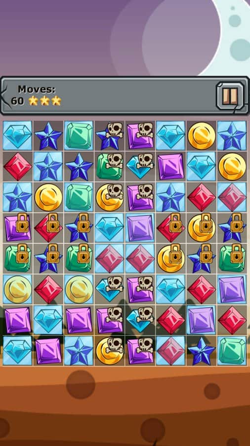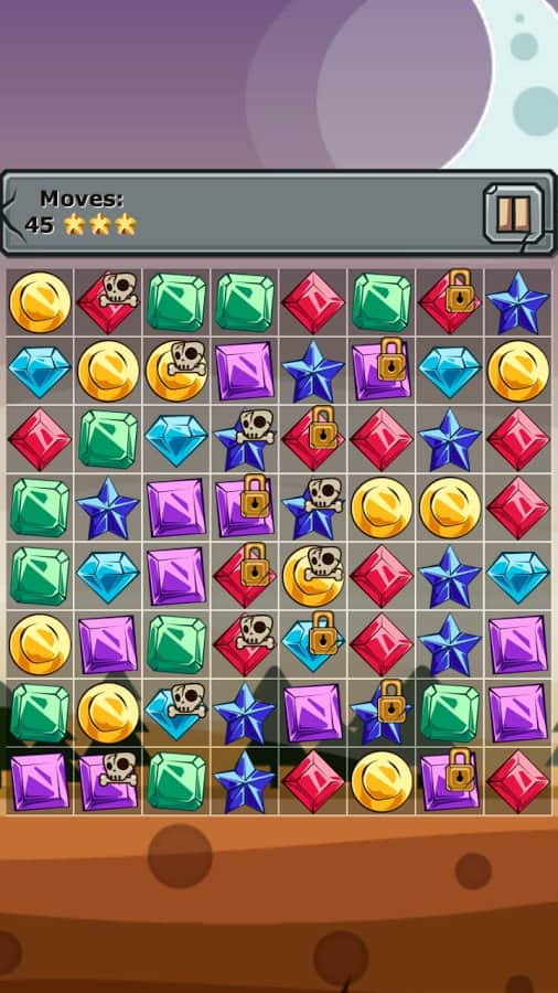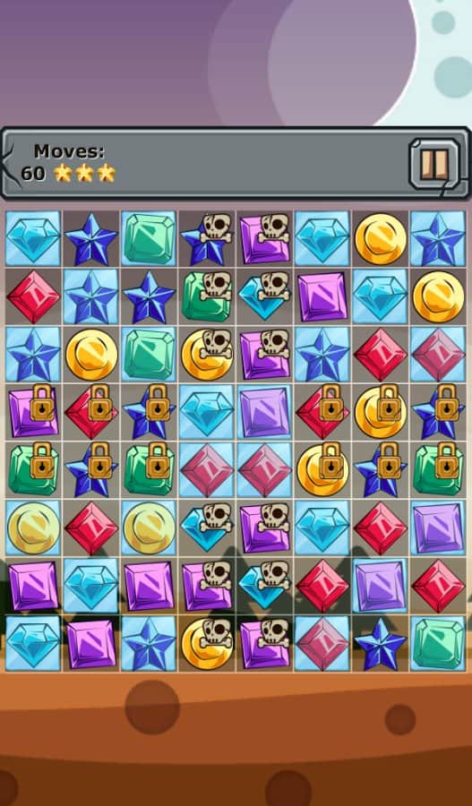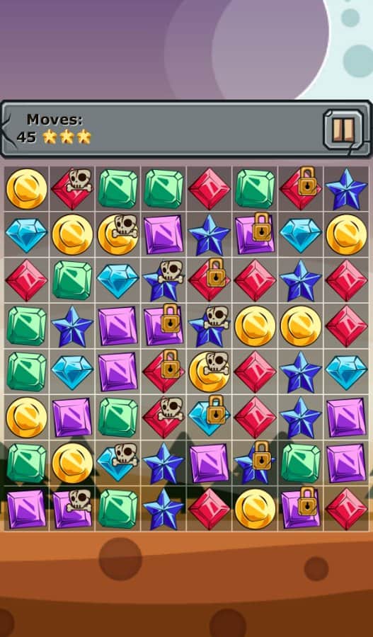 Jewels and Elements - игра из жанра три в ряд, в которой вас ждут более 250 уровней. Выстраивайте камни одного цвета в ряд и убирайте их с поля, а также разрушайте блоки со значками костей и замков которые дадут вам дополнительные бонусы. Создавайте камни стихий для этого составляйте камни буквой Т или L и убирайте с поля замороженные ячейки которые подвластны только им. Игра порадует вас яркой графикой и легким геймплеем.