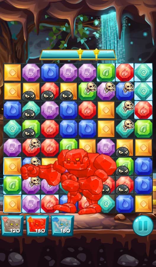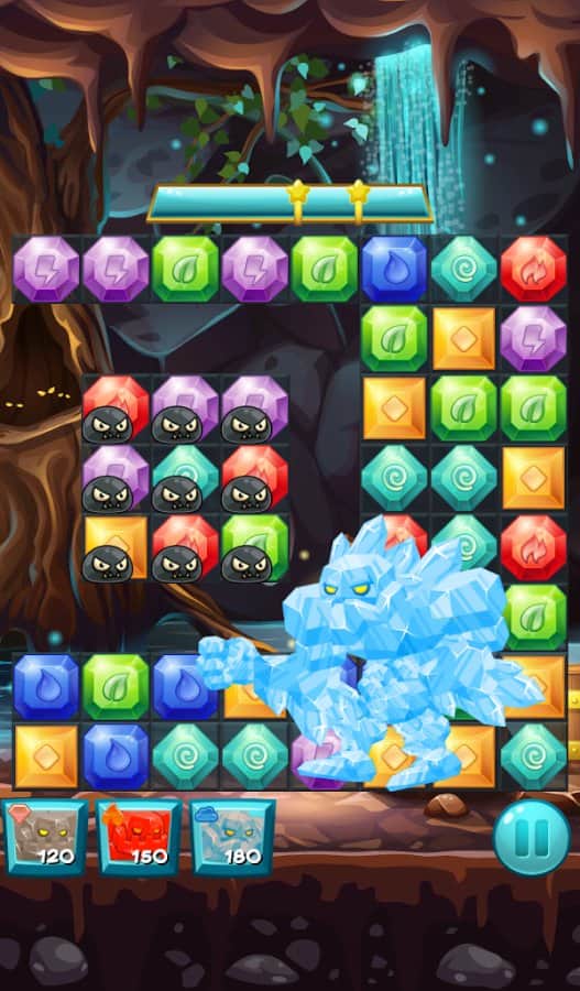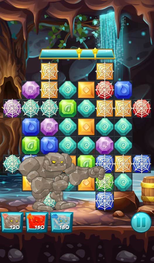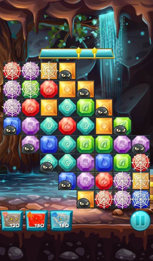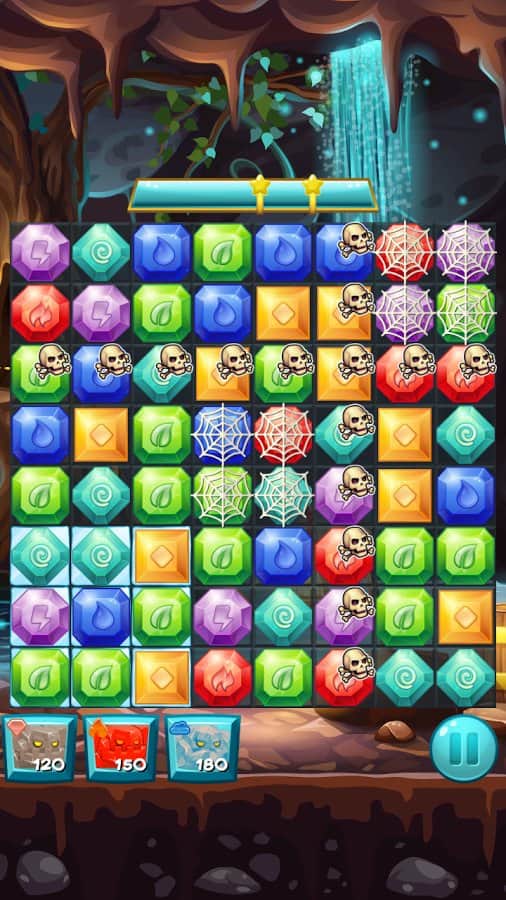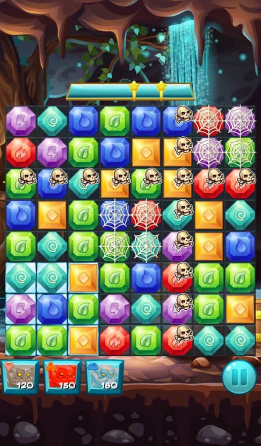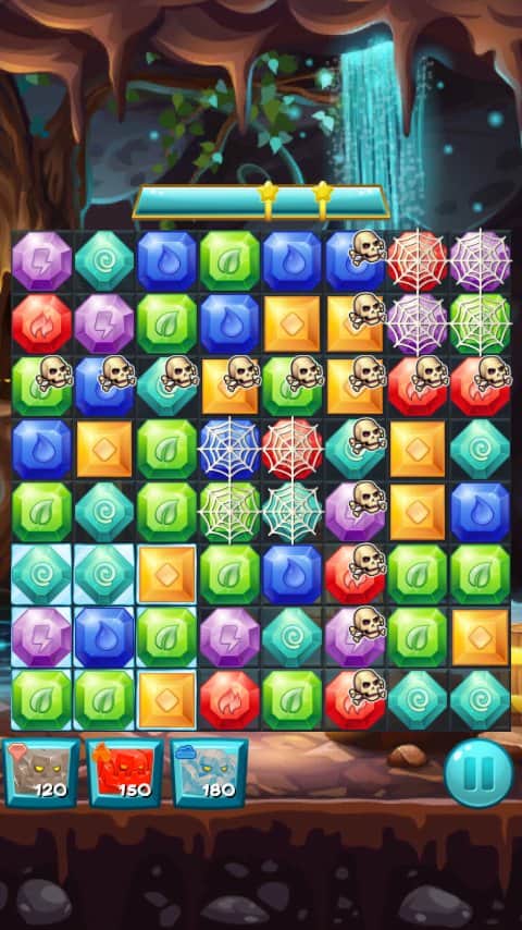 Jewels - Match 3 Game - увлекательная игра из жанра три в ряд, где вам предстоит собирать драгоценные камни в ряды. В этой игре вы попадете на поле, где находятся разноцветные камни, но помимо них там находятся замороженные ячейки, паутина, древние кости и надоедливые пузыри которые будут мешать вам идти к цели. Составляйте по три и более камня в ряд и очищайте игровое поле от замороженных ячеек и путины. Чтобы разрушить древние кости воспользуйтесь специальной магией, а также собирайте одинаковые по цвету камни в ряды, составляя их буквой T или L и получайте в награду стихийный камень который способен уничтожить всех врагов. Применяйте все свои умственные и логические навыки и решайте непростые головоломки.