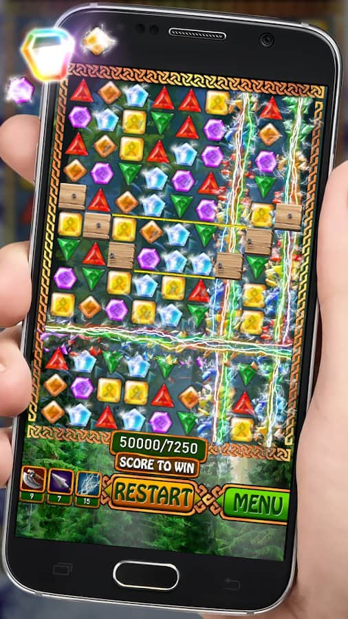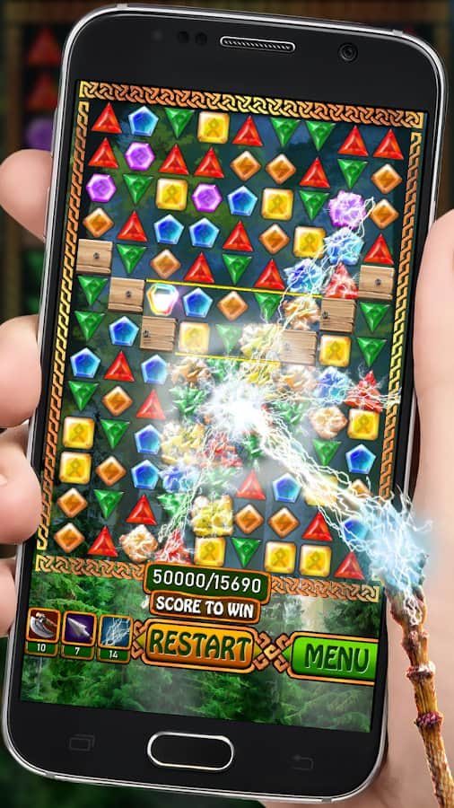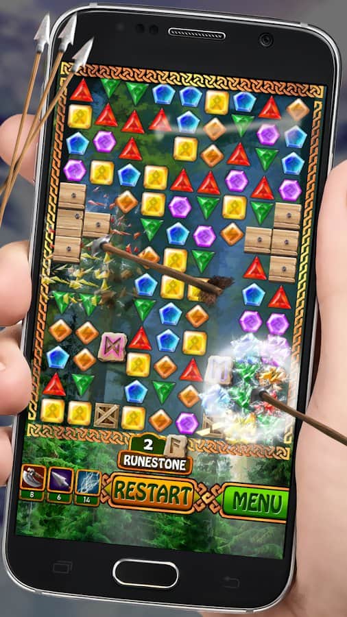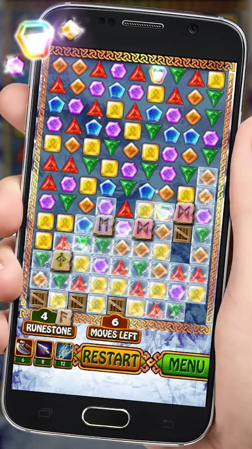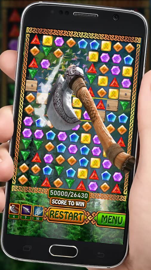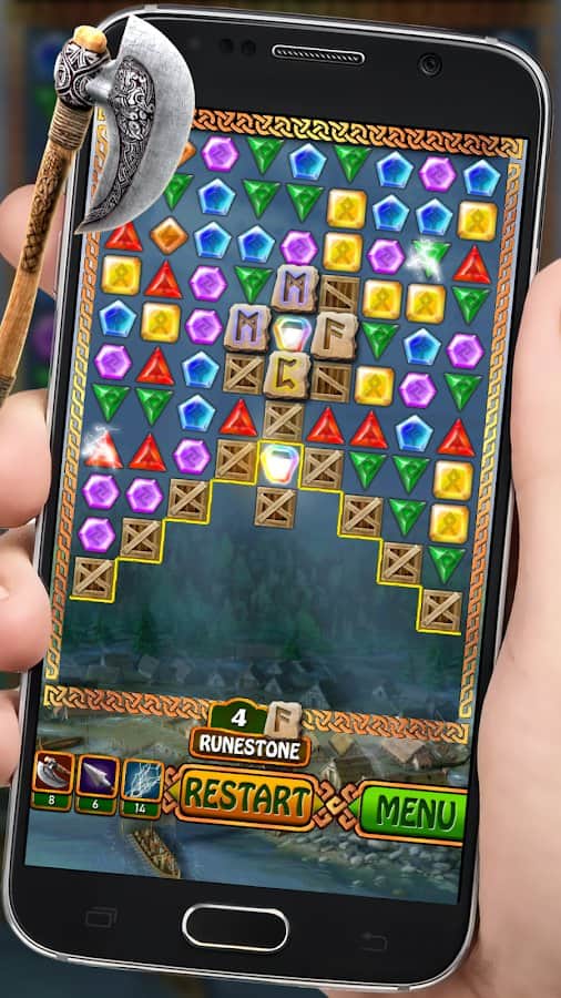 Jewels - Viking Runestones – захватывающая игра из жанра три в ряд на андроид, где вы будете формировать ряды из разноцветных кристаллов. В этой игре вы отправитесь в увлекательное путешествие по землям викингов, и вместе с ними будете решать многочисленные головоломки. Формируйте ряды из трех и более кристаллов и запускайте в действие цепную реакцию взрывов. Составляйте удачные комбинации и применяйте лук, топор или магию в сложных ситуациях. Открывайте для себя новые уровни, которые порадуют вас интересными заданиями. Игра порадует игроков красочной графикой, завораживающими эффектами и волшебными усилениями.