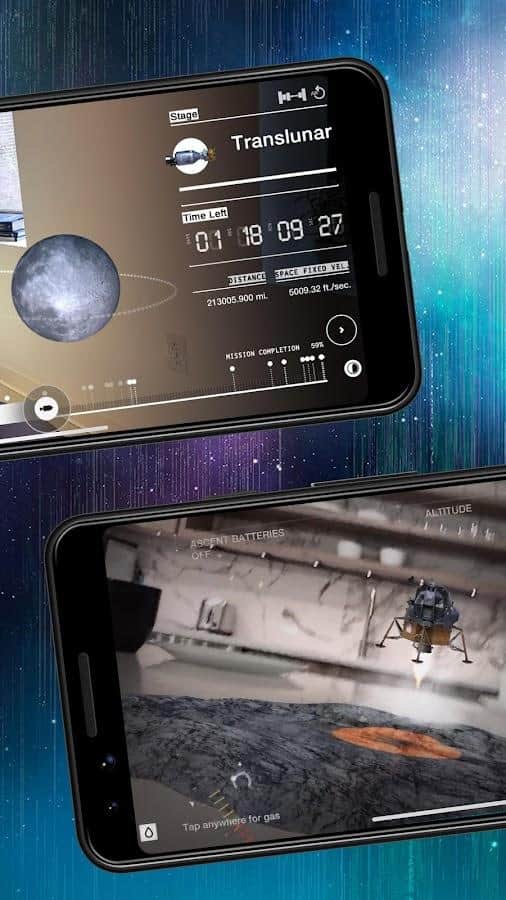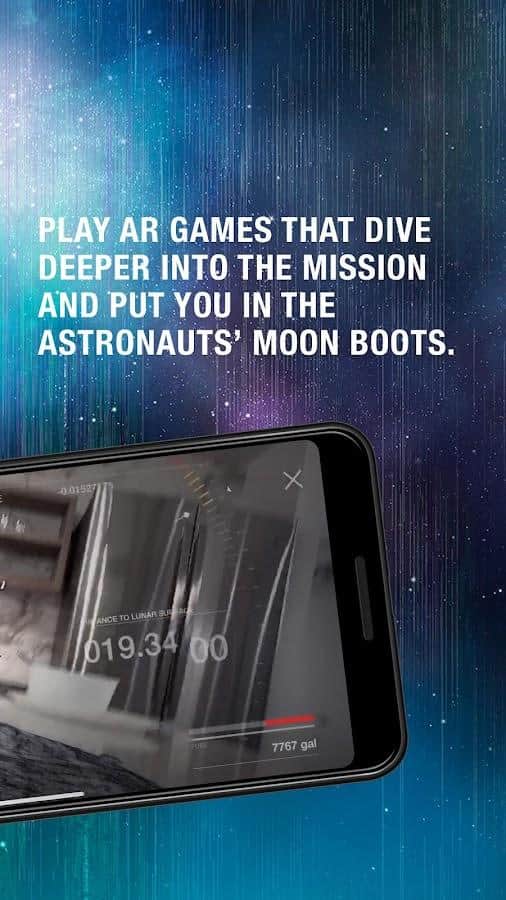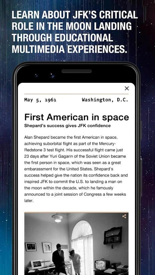 JFK Moonshot: An Augmented Rea - приложение для Android использует передовую технологию дополненной реальности, которая позволяет пользователям погрузиться в атмосферу 1969 года. Они могут полностью погрузиться в космический полет и посадку на Луну благодаря полномасштабному воссозданию ракеты Saturn V и 5-дневной симуляции в режиме реального времени. Дополнительные интерактивные кадры, архивные материалы NASA и образовательные мультимедийные приложения помогут пользователям глубже понять видение Президента Кеннеди и узнать больше о космической программе США.