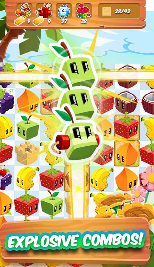 Juice Cubes - Три в ярд на андроид от создателей Angry Birds – компании Rovio. Вас ждет красочная игра с веселыми фруктами, которые обязательно развеселят вас! Собирайте цепочки по три и более вряд и фрукты исчезнут с поля. Вы можете соединять фрукты не только по горизонтали и вертикале, но и диагонали. При том изменять направление по ходу создания цепочки.