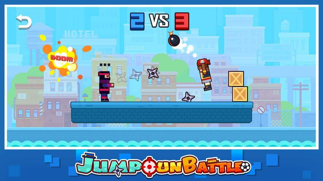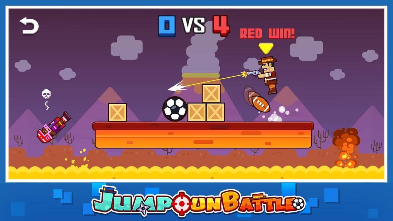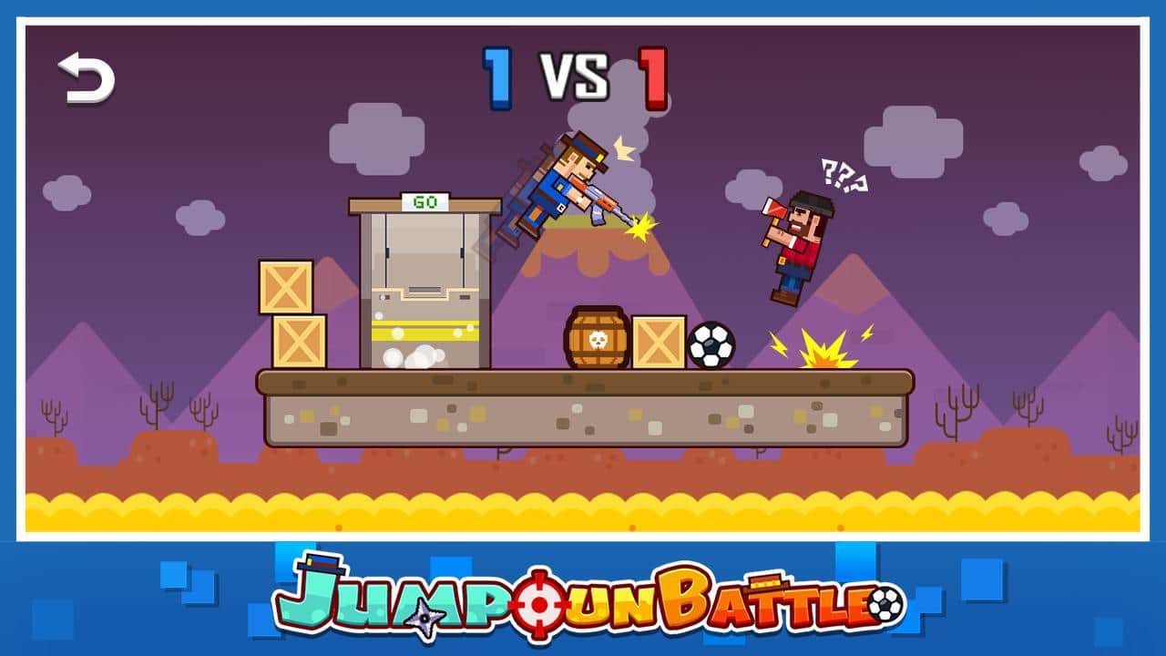 Jump Gun Battle – занимательная игра на андроид, где вы будете управлять стрелком и сражаться с соперником. Вы и ваш соперник стоите на одной платформе которая находиться над водой. Вашей задачей будет быстрее вашего соперника сделать выстрел и сбить его таким способом с платформы. Победит тот игрок кто останется один на платформе. Для того чтобы совершить выстрел удерживайте кнопку атаки и настраивайте траекторию выстрела чтобы угодить точно в цель. Получайте награды за успешные бои и открывайте для себя новых героев таких как: ниндзя, пират и спецназ, каждый из них будет обладать уникальным оружием. Играйте с друзьями на одном устройстве и весело проводите свободное время.
