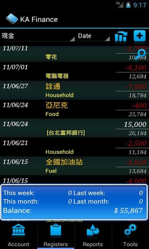 • Простое добавление новых трансакций и переводов между счетами (прокруткой экрана вниз по меню Записи).